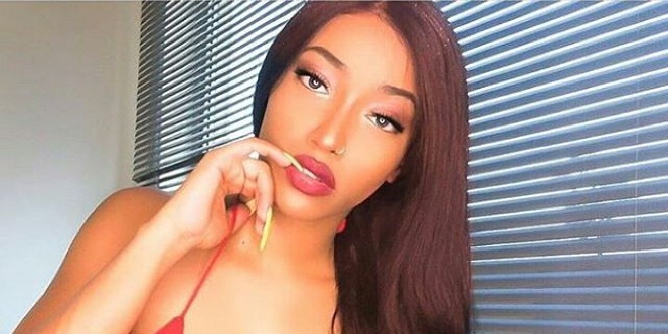 Ebonymilf mit Silikonmöpsen masturbiert ihre Fotze