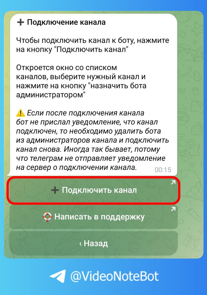 Бот пришлёт уведомление, что канал подключен