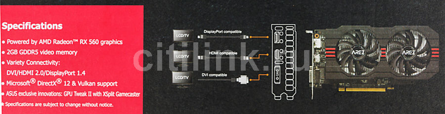 Модель . ASUS Radeon RX 560 2GB OC edition ( RX560 -O2G) Техпроцесс, нм . 14 (FinFET) GPU . AMD Polaris 21 . Микроархитектура