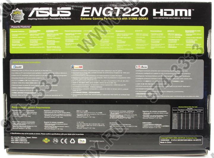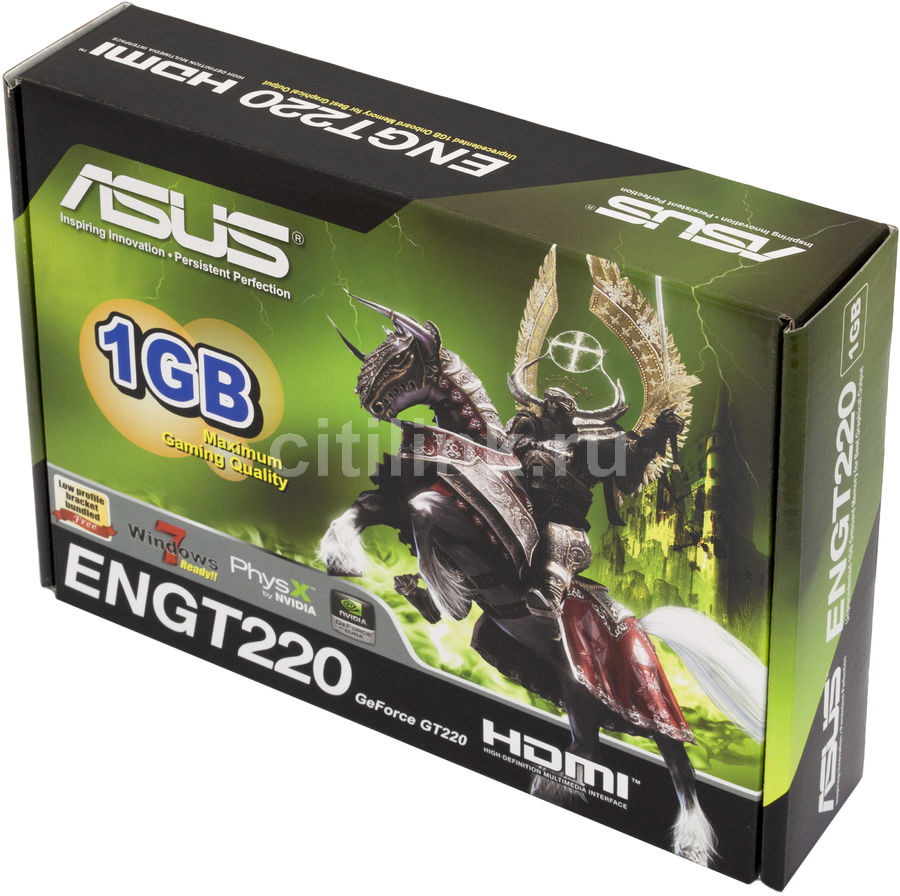 ASUS ENGT220 (part number ENGT220 /DI/512MD3) is one of a few ASUS Graphics Processing Units for desktop market . Based on NVIDIA GeForce GT 220, and The GPU is fabricated on 40 nm manufacturing process, and sports 2nd Generation Unified Shader architecture . The card's processor and graphics clock speeds are 1 .36 GHz and 625 MHz respectively .