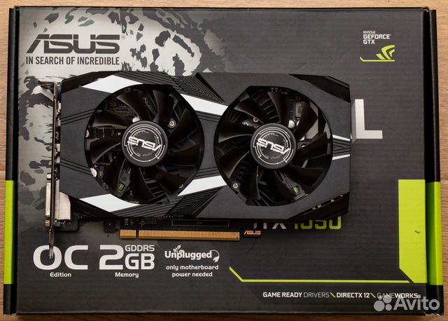 ASUS Dual GeForce GTX 1050 OC ( DUAL - GTX1050 -O2G-V2) Видеокарта поставляется в небольшой коробке без дополнительных переходников и каких-то аксессуаров .
