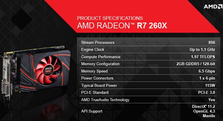 ASUS R7 260X DirectCU II OC 1 GB: 1075 MHz: 1600 MHz: 1024 MB, 216 mm/8 .5 inches: ASUS R7 260X DirectCU II OC 2 GB: 1188 MHz: 1750 MHz: 216 mm/8 .5 inches: ASUS R7 260X OC 1075 MHz: 1250 MHz: 221 mm/8 .7 inches: Club 3D R7 260X royalKing: 1160 MHz: 1650 MHz: 224 mm/8 .8 inches: Club 3D R7 260X royalQueen: 1100 MHz: 1625 MHz: 224 mm/8 .8 inches . . .