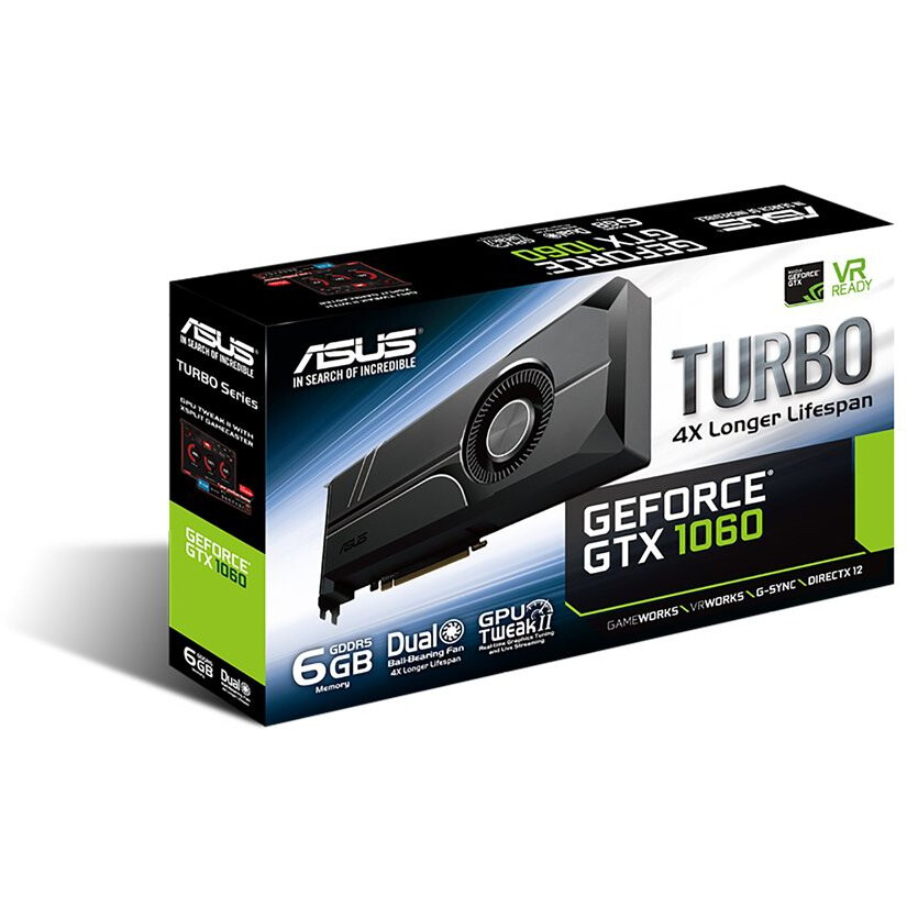 ASUS Turbo GeForce ® GTX 1060 6GB GDDR5 for best VR, 4K gaming and system integration . Dual-ball Bearing Fan runs smoother by reducing friction, further improving 4X longer card lifespan and cooling efficiency . Industry Only Auto-Extreme Technology with Super Alloy Power II delivers premium quality and best reliability .