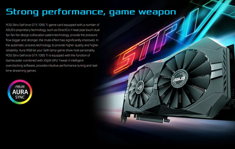 ROG- STRIX - GTX1050TI - O4G - GAMING . ROG Strix GeForce® GTX 1050 Ti OC edition 4GB GDDR5 with ASUS Aura Sync & G-SYNC™ for best 1080p gaming . 1506 MHz engine clock in OC mode for outstanding 1080p gaming experience . DirectCU II with Patented Wing-Blade 0dB Fans for 30% cooler and 3X quieter performance .