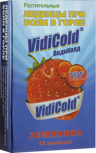ВидиКолд (VidiCold) леденцы со вкусом земляники обладают признаками клинической эффективности: - Оказывают противовоспалительное действие на воспаленное горло и верхние дыхательные пути