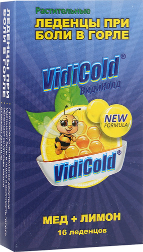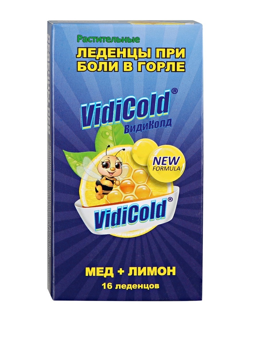 ВидиКолд (VidiCold) леденцы со вкусом меда и лимона обладают признаками клинической эффективности: Оказывают противовоспалительное действие на воспаленное горло и верхние дыхательные пути Обладают успокаивающим действием на раздраженное горло Уменьшают боль в горле и осиплость голоса Облегчают симптомы кашля Освежают дыхание