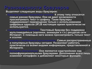 Виды браузеров: . . . Я выбрала тему «Браузеры и их виды», . . . С помощью браузера можно просматривать и загружать картинки, звуковые и видео файлы, . . .