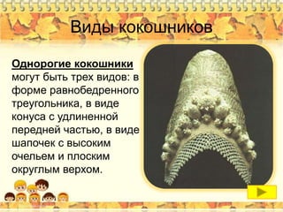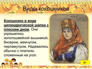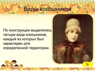 «Форма кокошников в разных регионах довольно разнообразна, как правило, она была обусловлена особенностями традиции укладывания волос, собранных в жгут или в две косы: вокруг головы, надо лбом, на затылке, на висках и . . .
