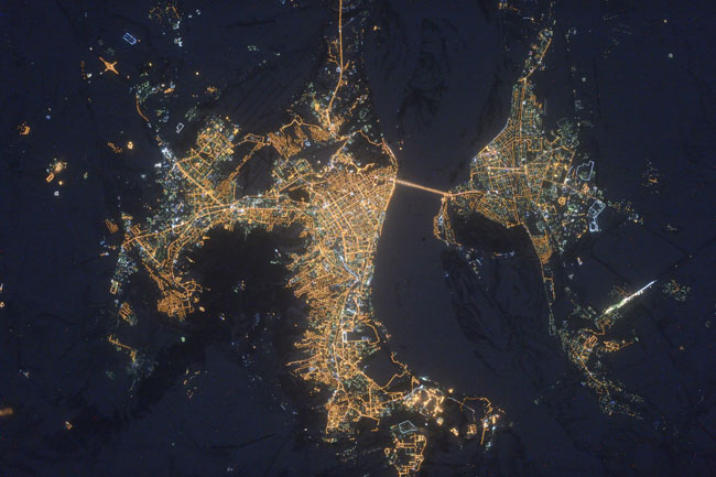 потрясающие виды из космоса . суша со спутника . красота ночных огней со спутника . фото планеты Земля со спутника . песочная поверхность . Ночной вид . Морозы . Яркие огни . Горизонт .