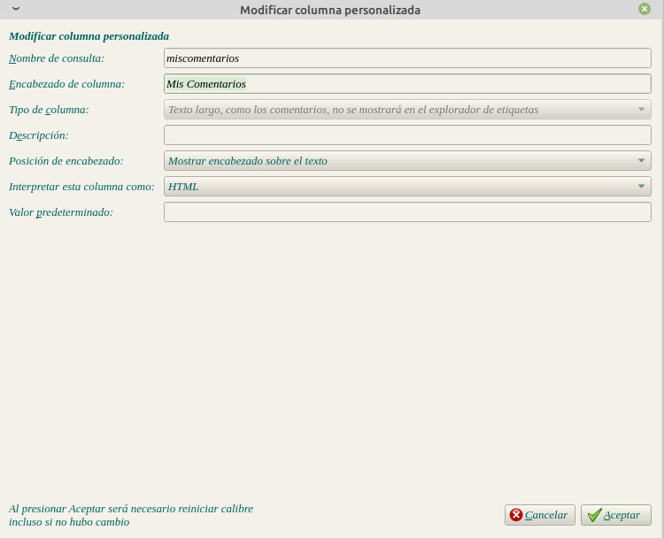 Primero debemos crear una columna personalizada por ejemplo "Mis comentarios" para que no interfiera con la que viene por defecto con calibre. Con estas especificaciones: