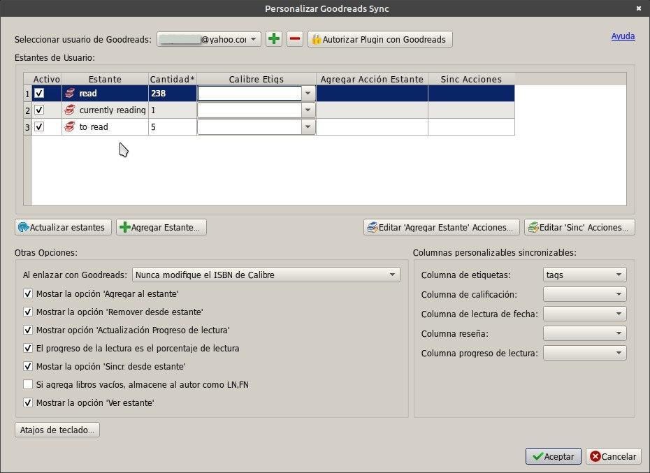 Así queda vinculado Calibre con nuestra cuenta goodreads. Adelante, mis valientes !!!!