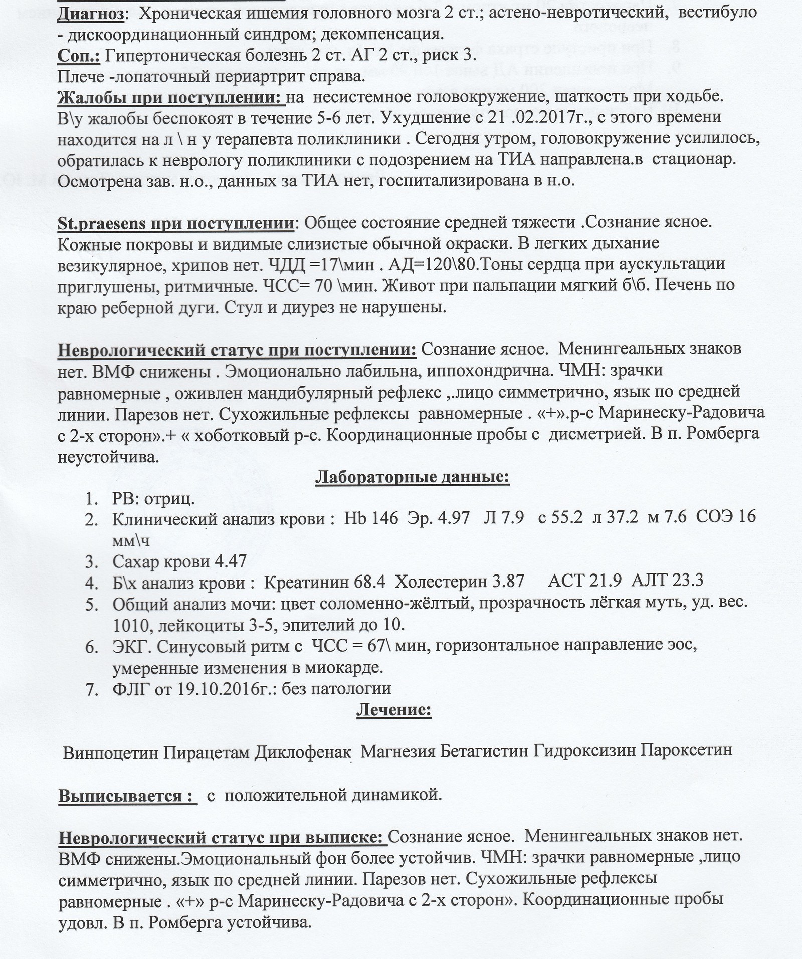 Лечение проводилось на неврологической койке дневного стационара: в/в капельно — винпоцетин, магнезия, рибоксин, диазепам; в/в струйно — мексидол, актовегин, в/м — глиатилин, амитриптилин; внутрь — фенибут под прикрытием гастропротекторов (Де-Нол), тримедат .