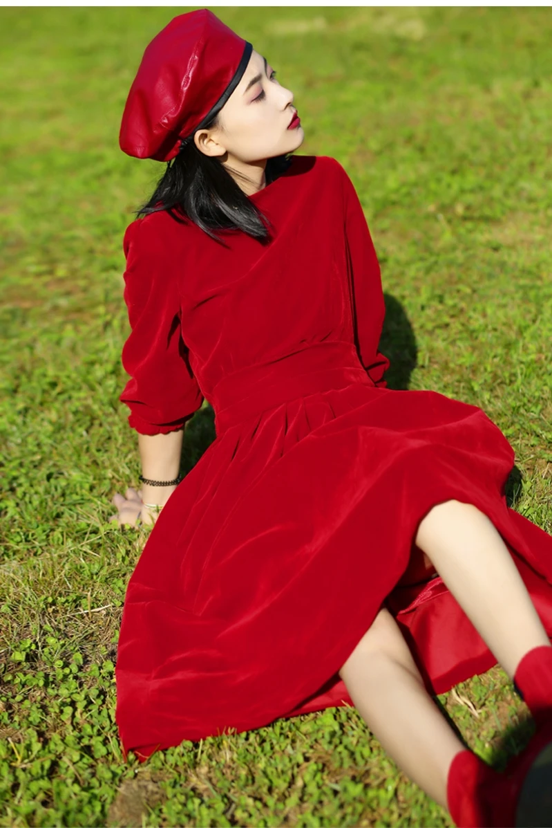 DEAT Women Midi Dress Pleated Bandage Round Collar Long Sleeeve Formal Style Elegant Dresses 2022 New Autumn Fashion 15JK422
