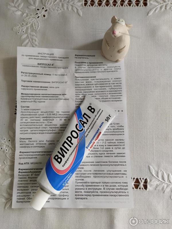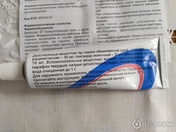 Срок годности Не более трех лет . Особые указания Сразу же после появления побочных эффектов разного рода необходимо отменить лечение данным препаратом . Важно помнить, что данная мазь со змеиным ядом в своем составе . Детям О целесообразности применения мази Випросал В для лечения детей должен принимать решение исключительно специалист . Аналоги