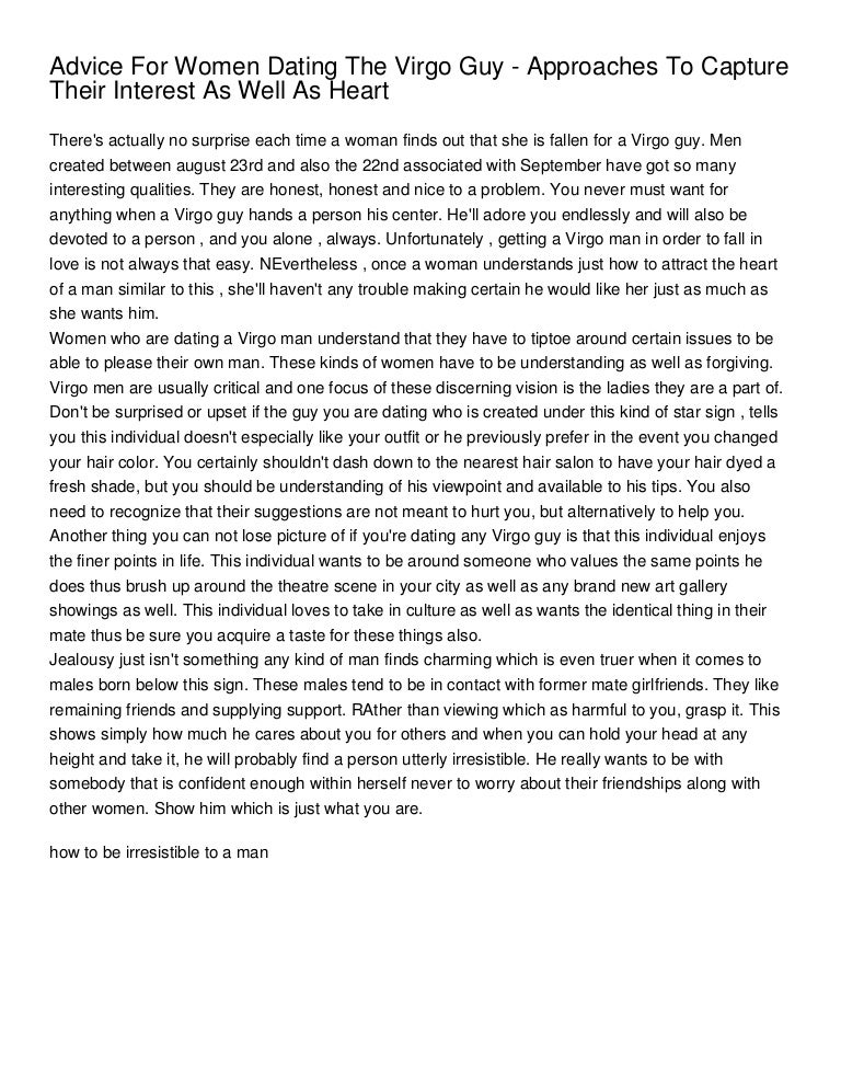 To a Virgo man, dating shouldn't mean "giving up" your life, but adding to it . So don't give up your friends, work or the life you had before . Don't stop living your best life because your relationship changed, either . Remember, a Virgo man is attracted to a woman who has plenty going on for herself .