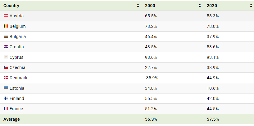 Note that Denmark’s value of -35.9% for the year 2000 is not a typo. Rather, it means that the country was a net exporter of energy.