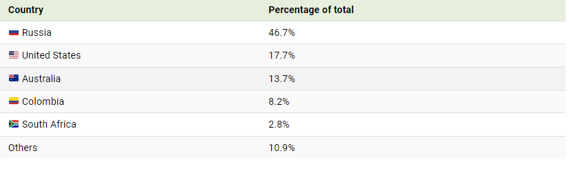Russia has the second largest coal reserves in the world. In 2020, it mined 328 million metric tons, making it the sixth largest producer globally.