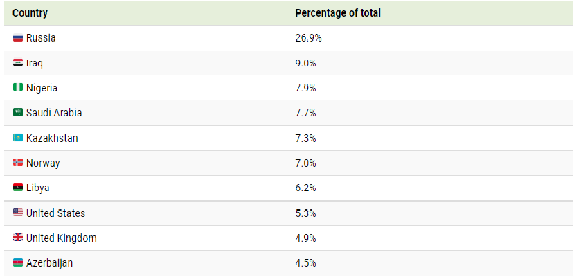 This shouldn’t come as a surprise, as Russia was the world’s third largest producer of oil in 2020. The country has several state-owned oil companies including Rosneft and Gazprom.
