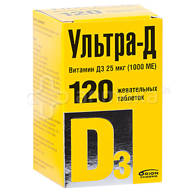 Ультра-д витамин д3 25 мкг (1000 ме), Таблетки жевательные . Показания, противопоказания, режим дозирования, побочное действие, передозировка, лекарственное взаимодействие ОРИОН ФАРМА