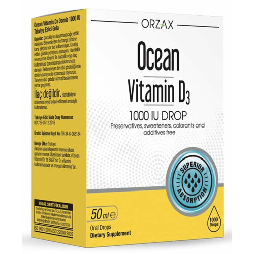 Ocean Vitamin D3 contient uniquement de la vitamine D et de l'huile d'olive pure. Il contient 1 000 UI de vitamine D dans chaque goutte. La vitamine D est une vitamine liposoluble qui remplit des fonctions importantes dans l’organisme. En vieillissant, notre corps commence à éprouver des difficultés à produire et à absorber cette substance importante. C'est pourquoi les suppléments de vitamine D sont importants pour maintenir une bonne santé. Les produits Ocean Vitamin D3 ne contiennent aucun conservateur, colorant, édulcorant, arôme artificiel ou sucre ajouté. Ce supplément de « vitamine du soleil » est essentiel à votre alimentation saine, qui peut manquer de vitamine D.• Aide à soutenir le système immunitaire et le bien-être• Renforce les os et les dents• Aide à soutenir une fonction nerveuse et musculaire optimale• Facile à prendre - directement du en IV ou en mélange avec votre boisson préférée Forme de libération : kpli, 50 ml Chaque goutte contient : Vitamine D3 - 25 mcg (1000 UI) Mode d'emploi : il est recommandé aux adultes de prendre 1 goutte par jour ou selon les recommandations spécifiques d'un médecin.