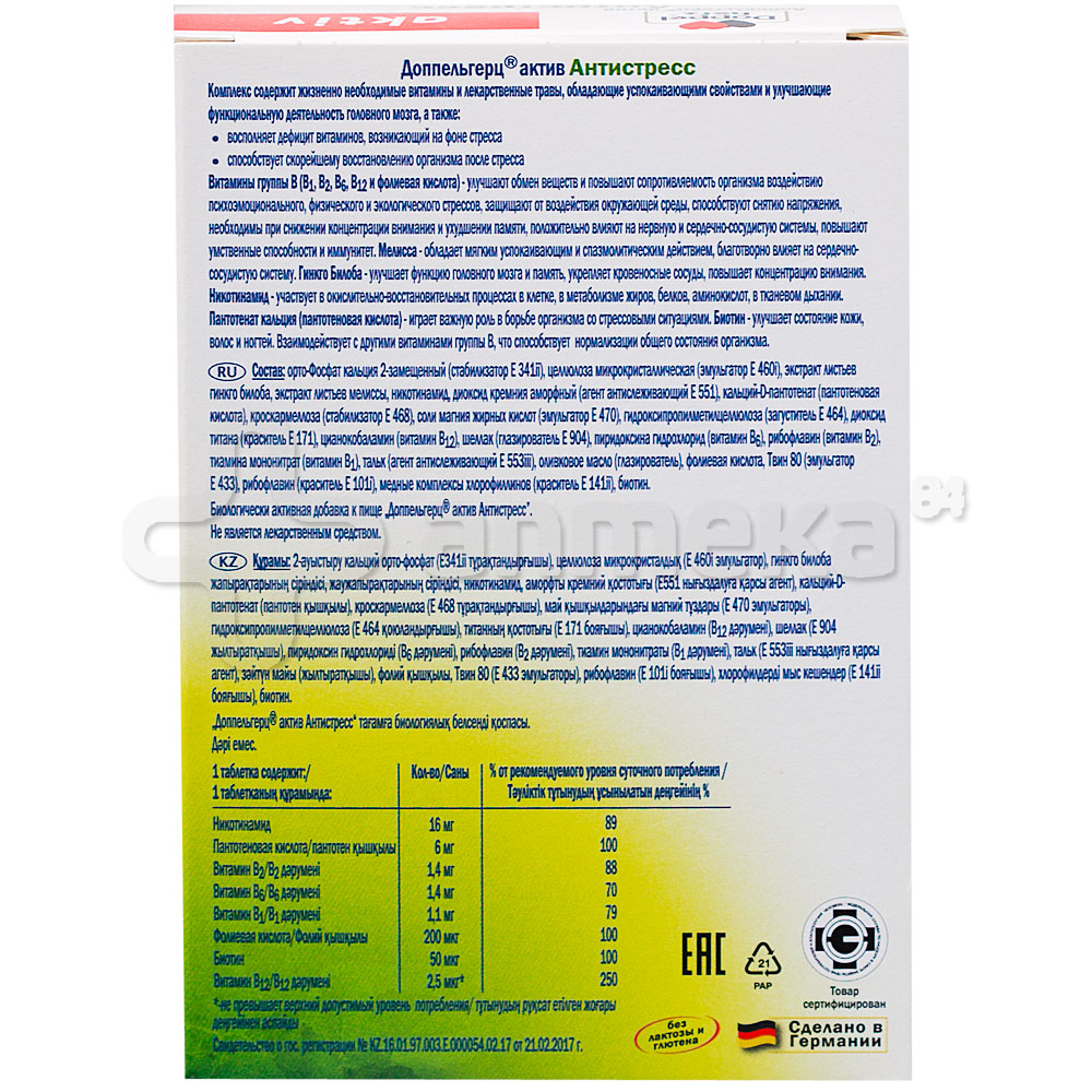 Доппельгерц Актив Антистресс таблетки, 30 шт . - Инструкция по применению Состав активные вещества: сухой экстракт мелиссы - 40 мг Сухой экстракт Гинкго Билоба - 50 мг, Никотинамид 16 мг, витамин B1 -1,1 мг, витамин B2 -1,4 мг, витамин B6 - 1,4 мг, витамин B12 - 2,5 мкг, Фолиевая кислота - 200 мкг, биотин -50 мкг Пантотеновая кислота - 6 мг .
