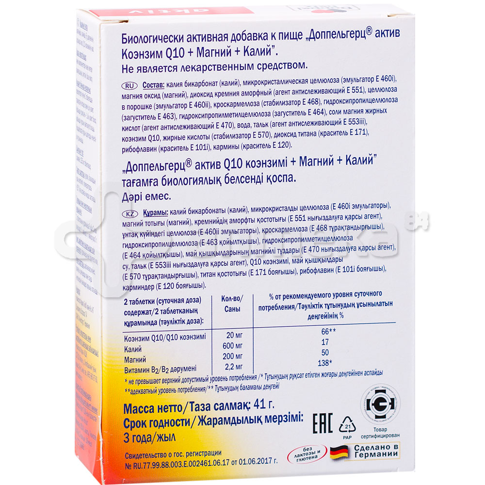 ДОППЕЛЬГЕРЦ® АКТИВ КОЭНЗИМ Q10+ МАГНИЙ + КАЛИЙ . Food supplement . Оценить этот продукт . В избранное . Перейти в Избранное . Специально подобранные компоненты комплекса, способствующие улучшению . . .