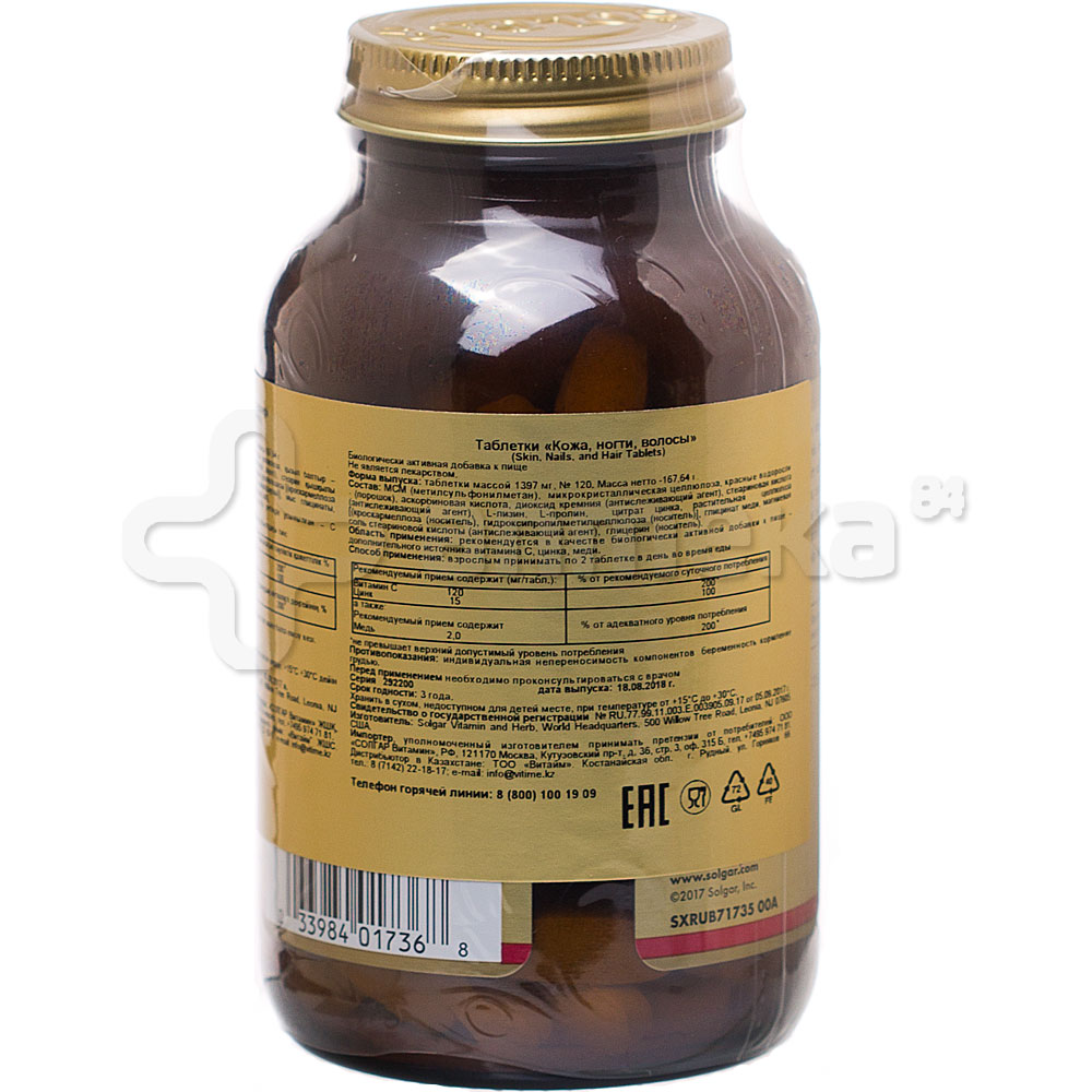 В составе каждой из 120 таблеток - больше потребности веществ в сутки . По количеству меди - двойная норма за 24 часа . Все активные компоненты БАДа от Солгар охватывают все направления по улучшению состояния волос, кожного покрова . Состав БАДа Состав с повышенным содержанием протеина, аминокислот хорошо усваивается организмом . Как употреблять