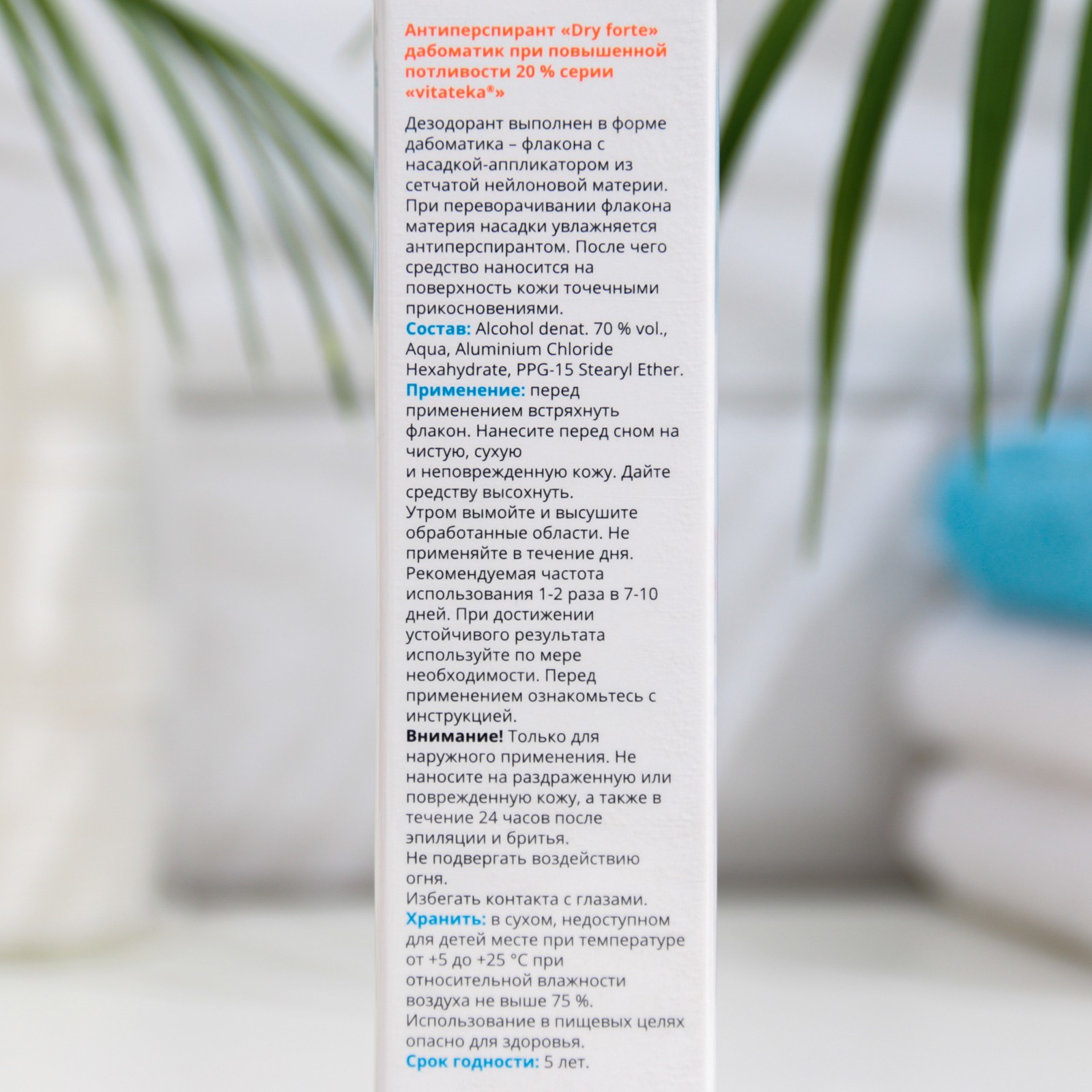 Дезодорант Dry forte vitateka — дабоматик антиперспирант на спиртовой основе, позволяет значительно снизить и при регулярном применении нормализовать избыточное потоотделение . Дезодорант обеспечивает эффективную защиту от пота на срок до 5 дней . Является безопасным и эффективным средством при применении согласно инструкции .