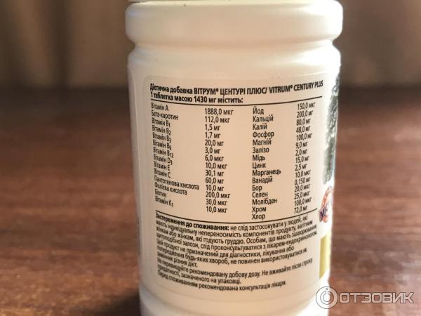 Витрум Центури (Vitrum Century) - поливитаминный комплекс, предназначенный для пожилого организма . Лучше всего подходит для лиц после 50 лет и пожилых людей старше 60 лет . В составе содержатся компоненты, которые снижают риск развития заболеваний, замедляют процессы старения и повышают работоспособность .
