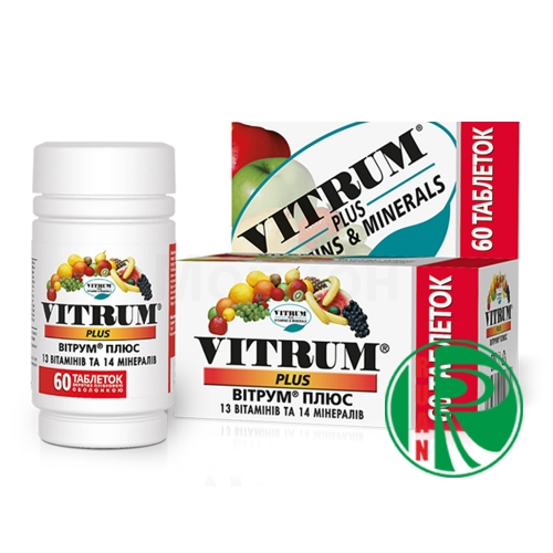 Состав Одна таблетка Витрум Плюс включает: Вит . А - 4400 МЕ Вит . В1 - 1,5 мг Вит . В2 - 1,7 мг Бета-каротин - 600 МЕ Вит . В6 - 2 мг Вит . В12 - 6 мкг Вит . С - 60 мг Вит . Е - 30 МЕ Вит . D3 - 400 МЕ Вит . К1 - 25 мкг Никотинамид - 20 мг Биотин - 30 мкг Пантотеновая кислота -10 мг Фолиевая кислота - 400 мкг Ca - 162 мг Cr - 25 мкг Cl - 36,3 мг