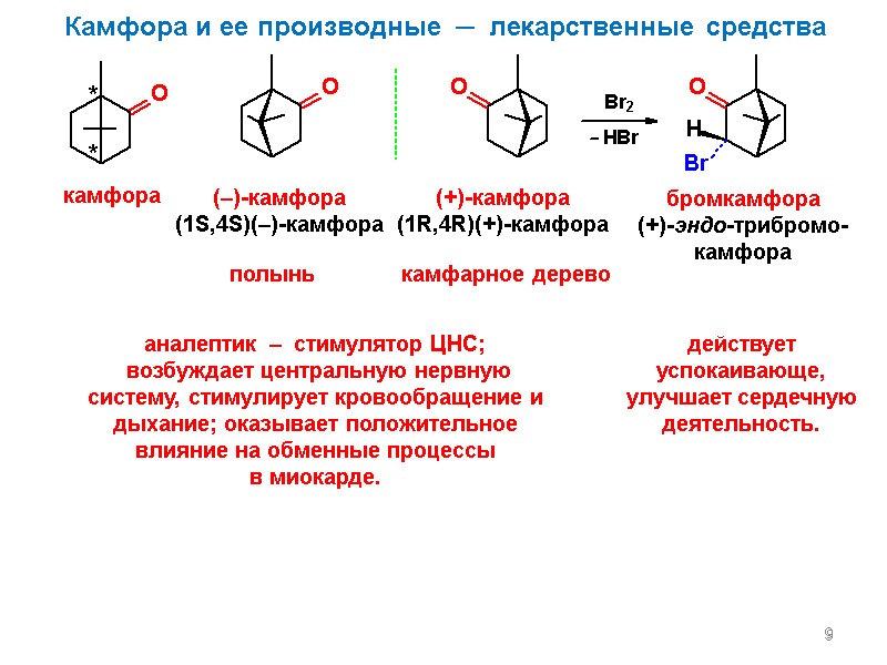 Влияние на ЦНС Камфора повышает чувствительность дыхательного центра к углекислому газу, ацидозу и рефлекторным воздействиям с хеморецепторов сосудов и болевых окончаний кожи . Слабее тонизирует сосудодвигательный центр .