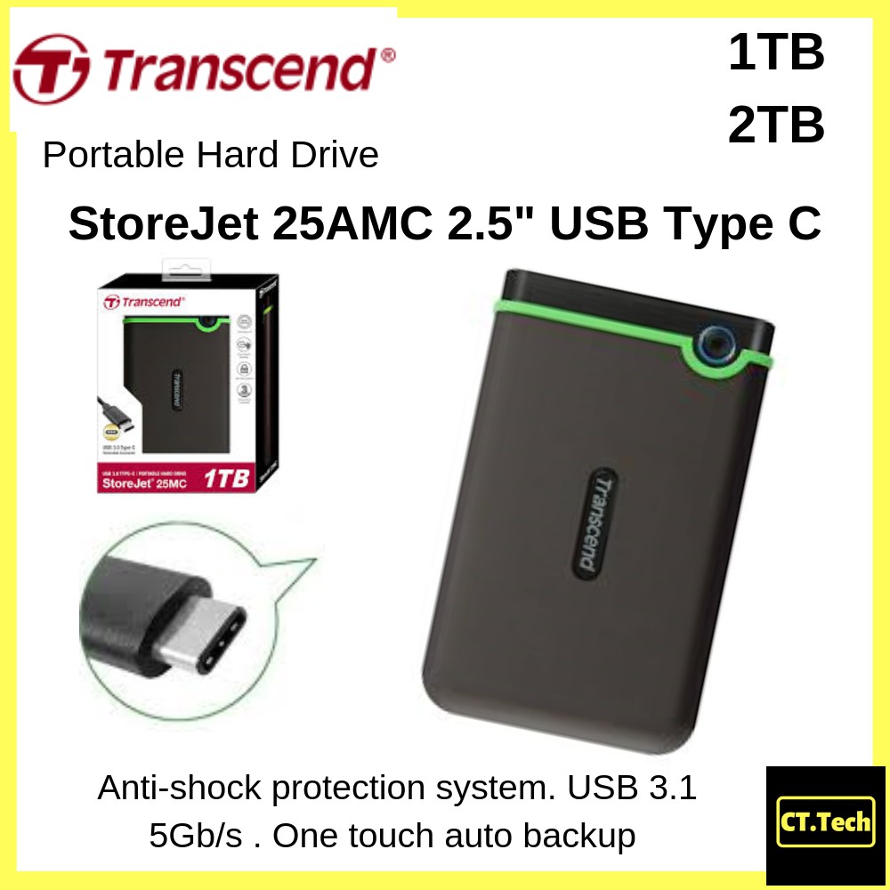 StoreJet 25M3C . Transcend's StoreJet 25M3C ruggedized portable hard drive features the USB 3 .1 Gen 1 interface and a USB Type-C port for unmatched transfer rates, and comes with both a USB Type-C cable as well as a Type-C to Type-A cable for max compatibility across devices . Supreme shock-resistant qualities ensure superior protection for data . . .