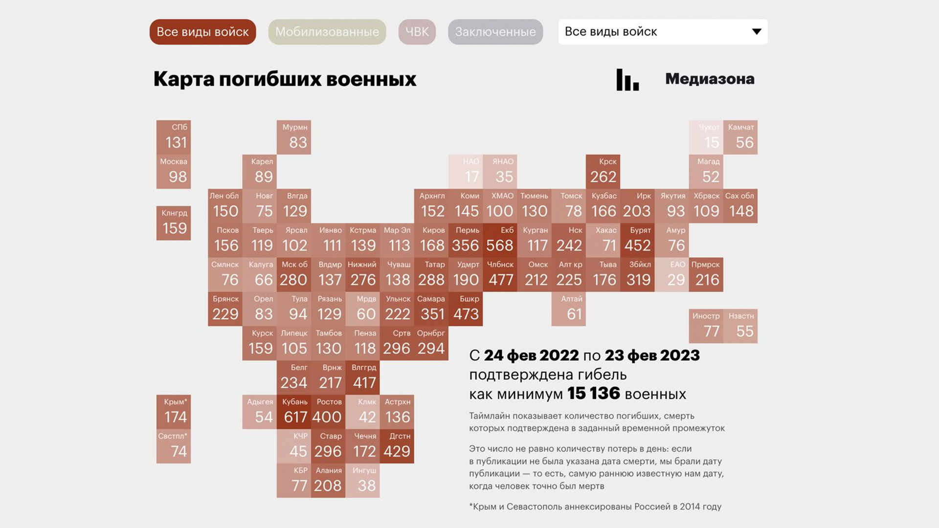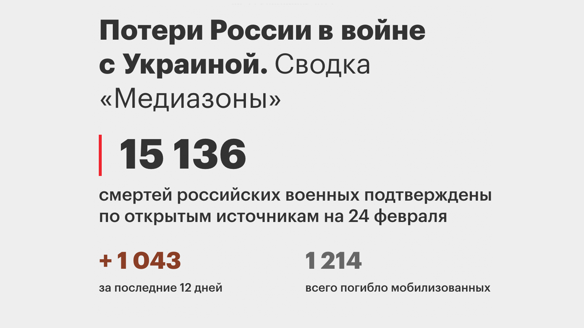 За год войны журналистам удалось установить имена 15 136 погибших российских военных в Украине. Для сравнения, это уже больше, чем официальные потери СССР в Афганистане за девять лет. Но, как вы понимаете, это самая минимальная оценка потерь. Наиболее реалистичной выглядит оценка в 50-60 тысяч погибших российских солдат.