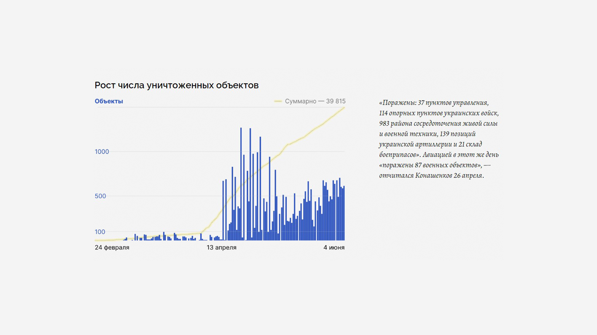 Самая циничная ложь, конечно, о потерях. Мы помним, как в конце марта отчитались о 1351 погибшем военном и на много месяцев замолчали, хотя было ясно, что уже на тот момент потери куда больше. Зато количество уничтоженных украинских военных объектов в какой-то момент начало расти как на дрожжах, вот сами видите скачок на графике. При том что за пару недель до этого скачка российская армия отступила из-под Киева и каких-то резких перемен на фронте не происходило.