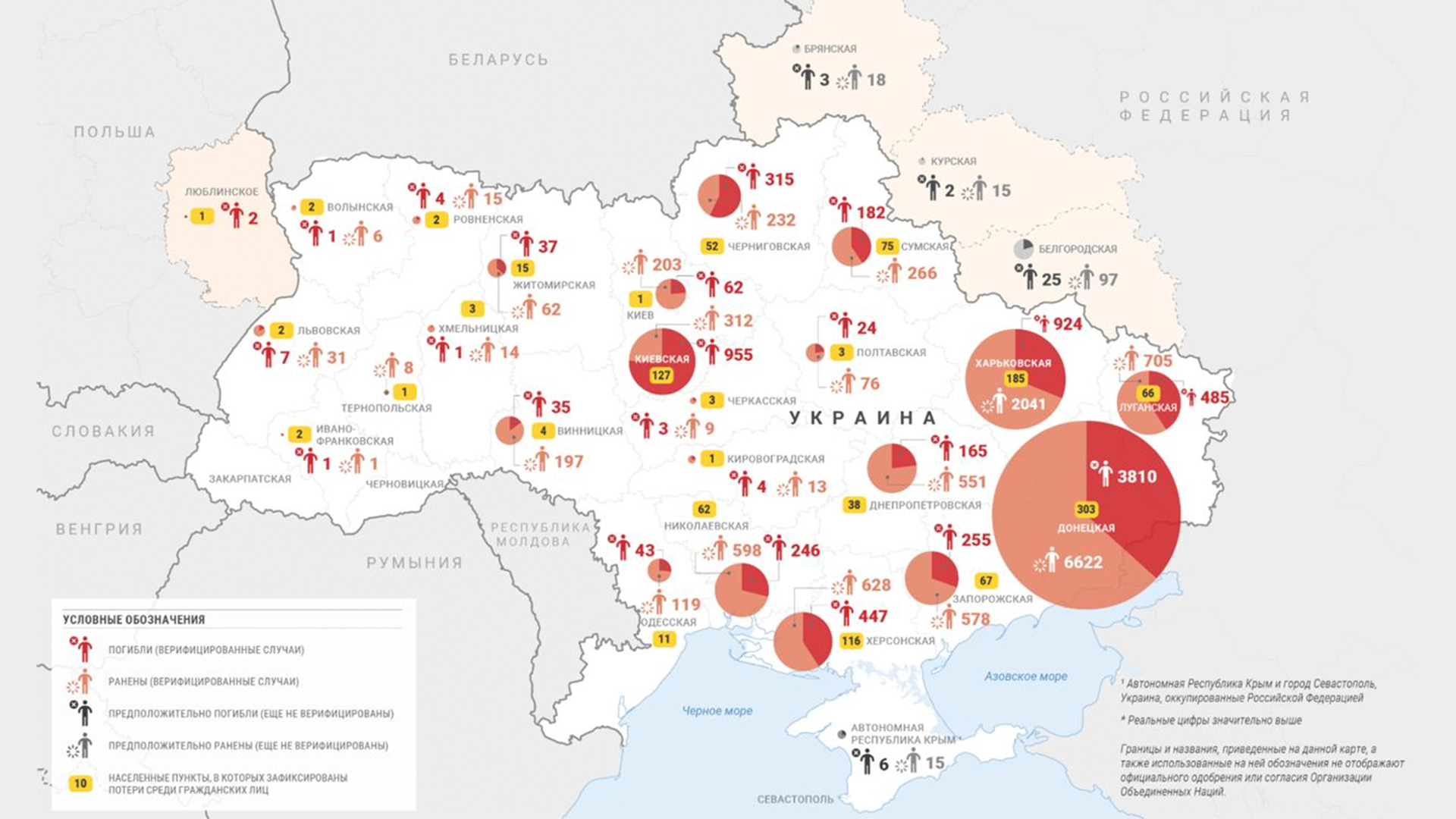 И конечно, мы не можем не говорить о потерях мирных украинцев, погибших с начала российского вторжения. ООН насчитала 8006 погибших и 13 287 раненых мирных украинцев. Больше всего жертв в Донецкой, Киевской и Харьковской областях. Больше половины смертей произошло в первый месяц войны, когда были проблемы с эвакуацией гражданского населения. Но реальное количество жертв, конечно, удастся установить только после полного освобождения Украины. Только тогда получится понять хотя бы приблизительное количество жертв в том же Мариуполе.