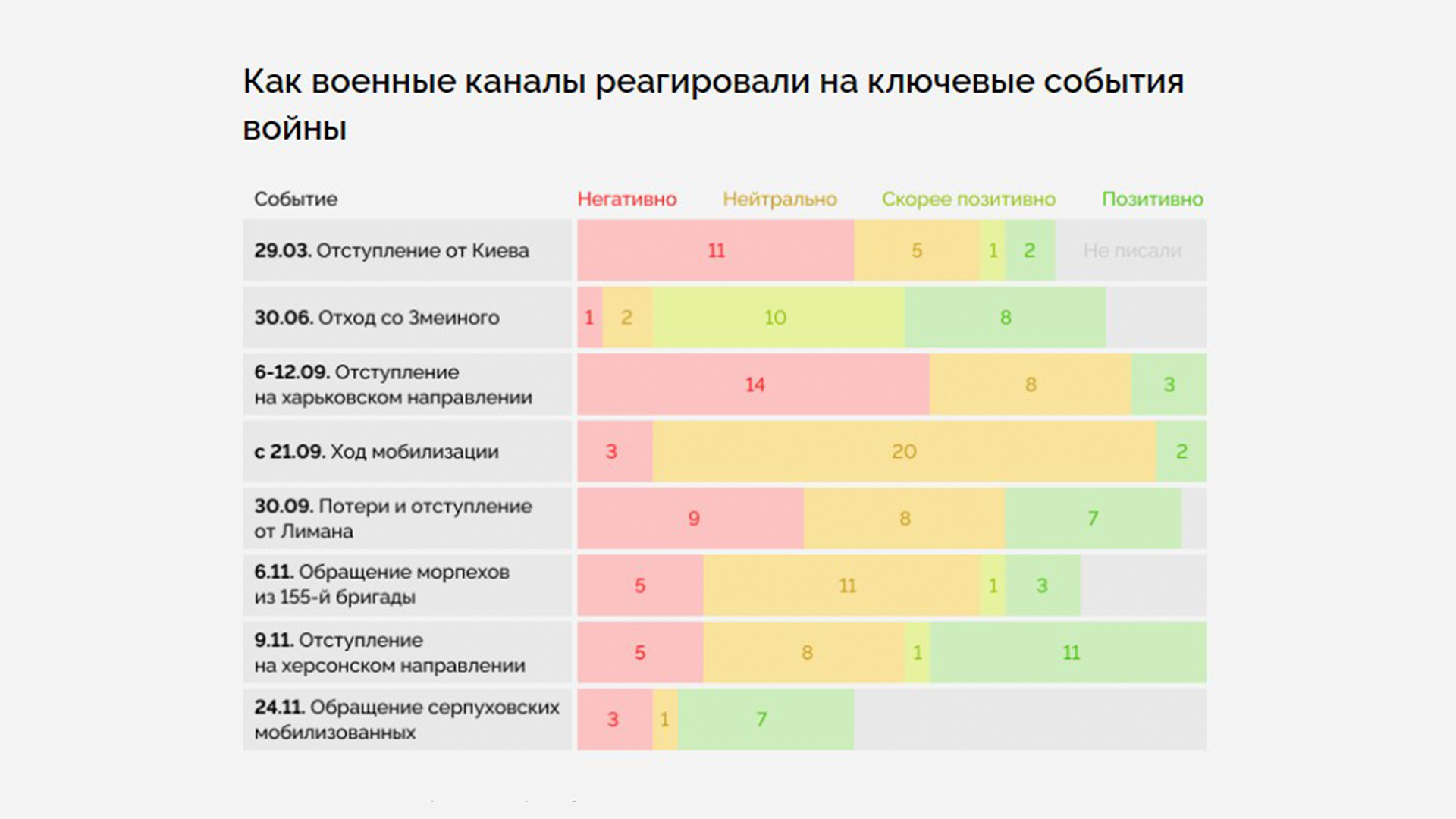 Неподготовленные немотивированные солдаты, которых силой забрали на войну, могут кого-то задавить числом, потому что их жизни для командиров ничего не стоят, но вряд ли они кратно усилят путинскую армию. А еще ее ослабляет постоянная внутренняя грызня. Есть Минобороны, есть ЧВК, есть так называемые военкоры, и все они как пауки в банке. Военкоров, которые в начале войны много писали про ошибки командования, смогли купить — вот на этом графике видно, как их посты становились все более хвалебными.
