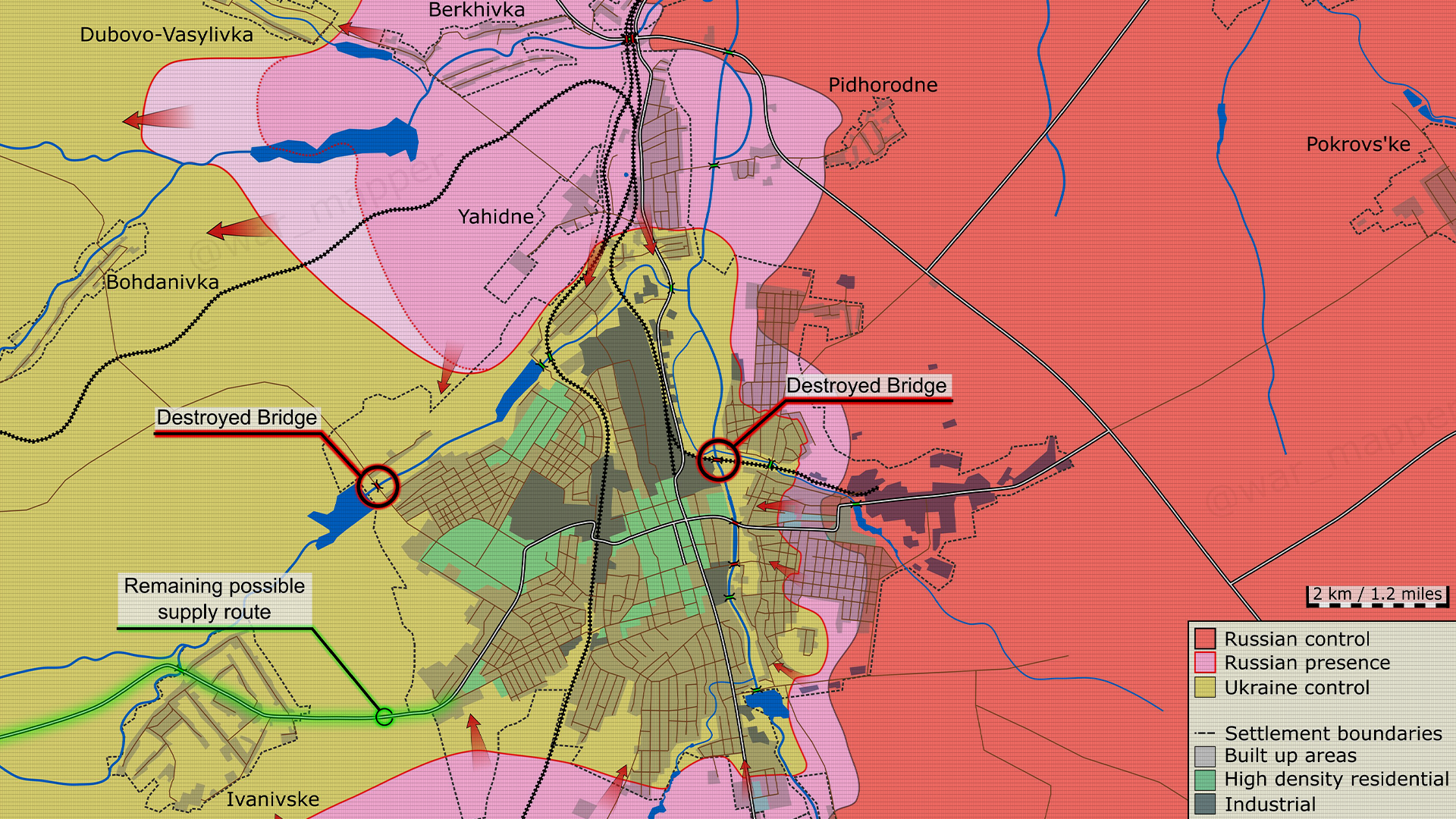 Вот фото этого моста. Теперь у ВСУ остается только дорога через Ивановское — снабжать город в полукольце крайне тяжело. Уже и американский Институт изучения войны пишет, что идет контролируемый отход из некоторых районов Бахмута.