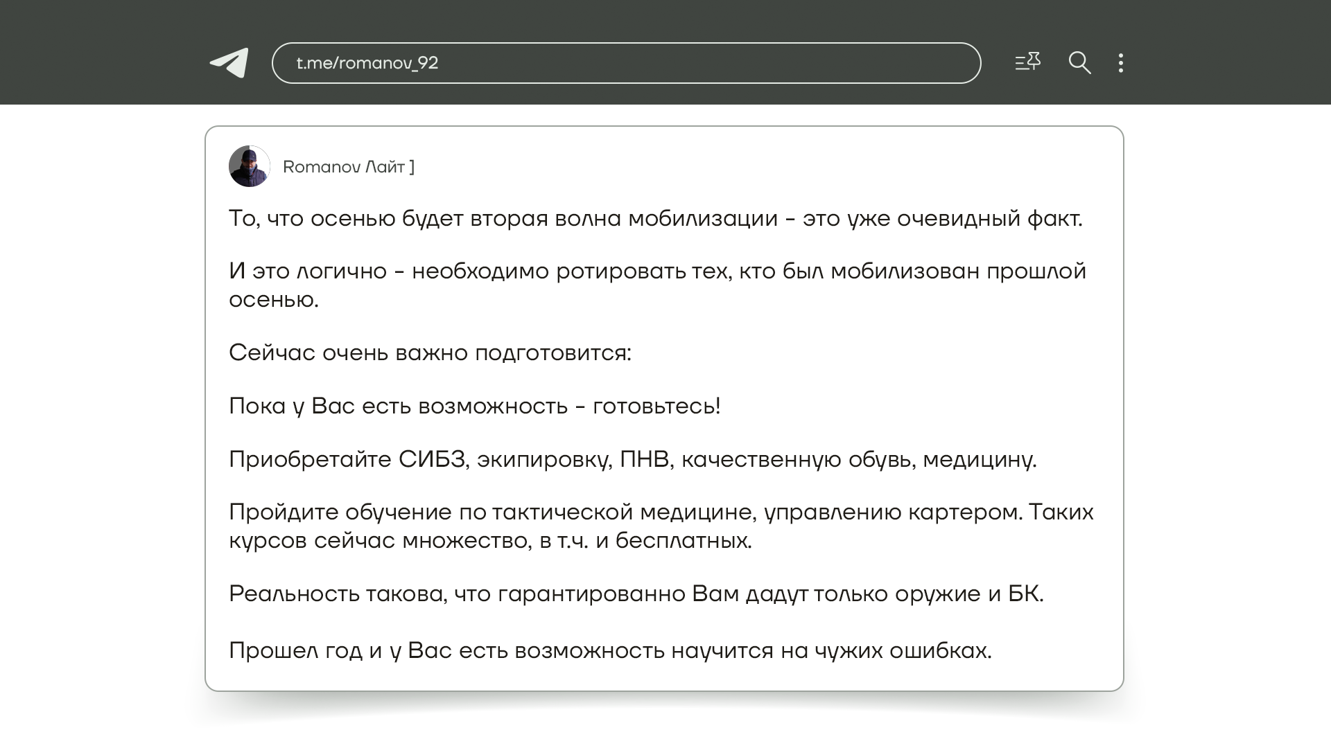 На фоне новых законов зет-патриоты впервые с мая начали говорить о том, что мобилизация все-таки нужна. Вот один такой обращается к своим читателям, мол, угадайте, когда начнется вторая волна мобилизации. Сам он считает, что вторая волна необходима осенью, для ротации войск. И советует своим подписчикам уже закупать новую экипировку уже сейчас. Не делайте так, если что. Готовится к мобилизации надо, не закупая экипировку, а думая о том, как ее [мобилизацию] избежать.