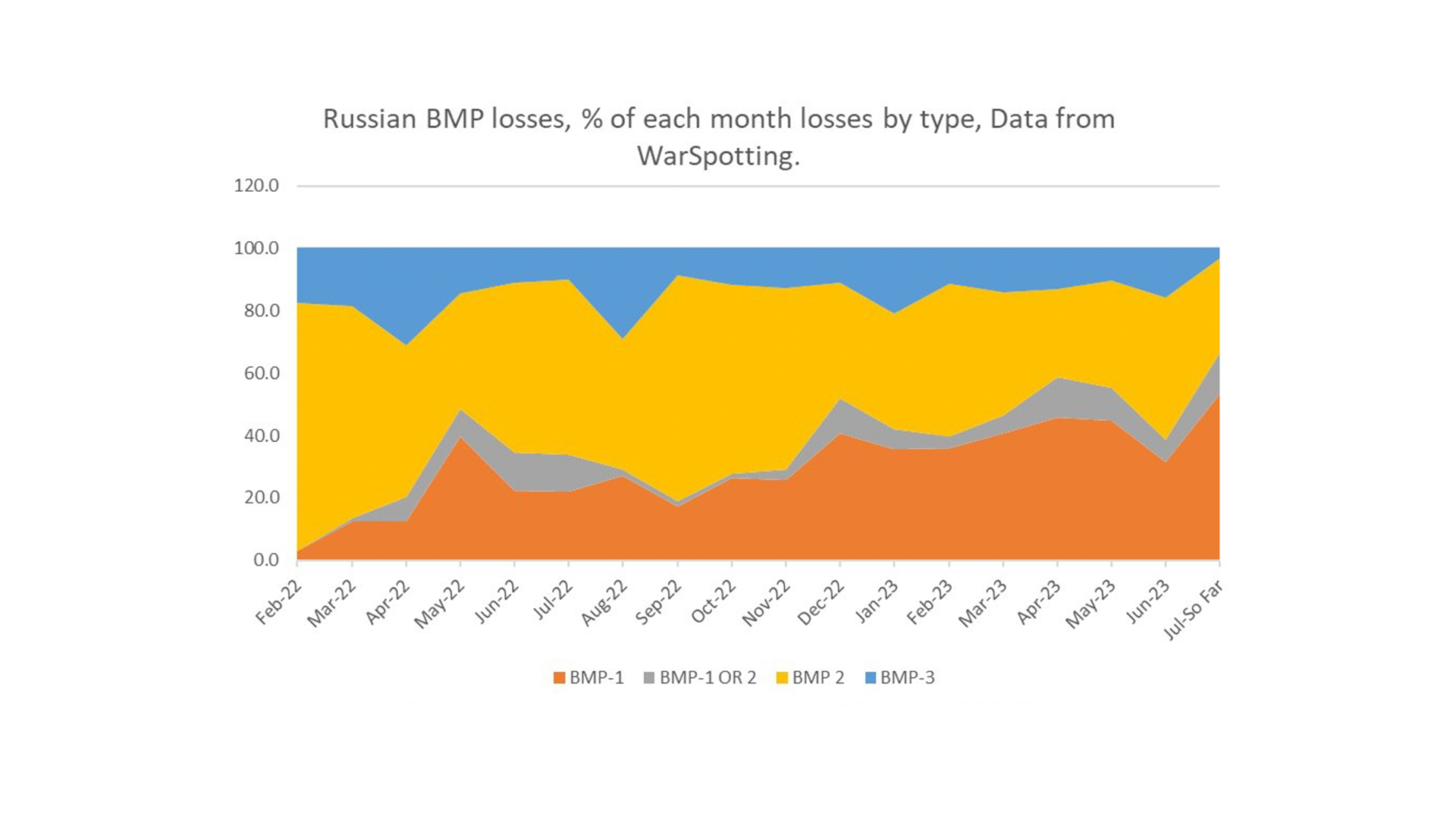 Сделав анализ потерь российских БМП по типам и времени становится понятно, что сейчас российская армия намного чаще теряет старые БМП-1, чем в начале войны. А доля потерь БМП-3 наоборот очень сильно сократилась, несмотря на то, что их производство в Кургане вроде как тоже нарастили. Так что можно сделать вывод, что российский военпром сейчас не может восполнить потери новой техникой. Для этого нужно всю экономику переводить на военные рельсы. А желания и возможности это делать, к счастью, у путинской власти нет.