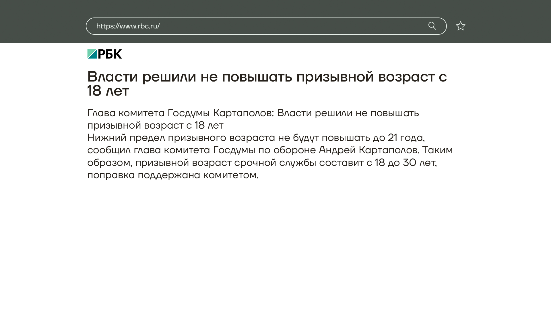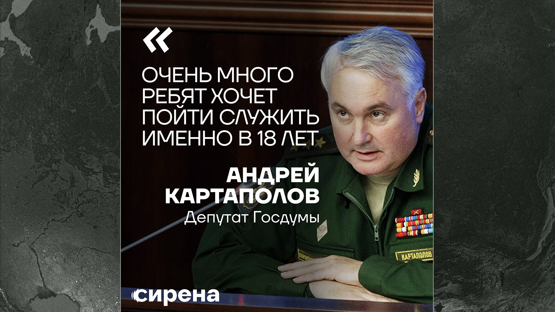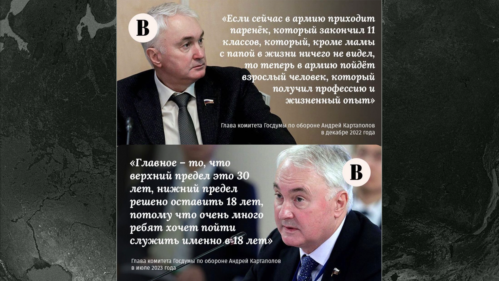 А власти российские врут постоянно. Вот, например, всеми «любимый» глава комитета Госдумы по обороне Андрей Картаполов вчера объявил, что нижнюю границу призывного возраста повышать не будут. Изначально заявлялось, что в армию будут призывать с 21 до 30. А теперь — с 18 до 30 будут забирать в армию. Картаполов объяснил это тем, что молодые люди якобы страшно рвутся на службу, как только достигают совершеннолетия. Но, конечно, всё это просто предлог, чтобы набирать в армию еще 2 с лишним миллиона человек от 18 до 30.