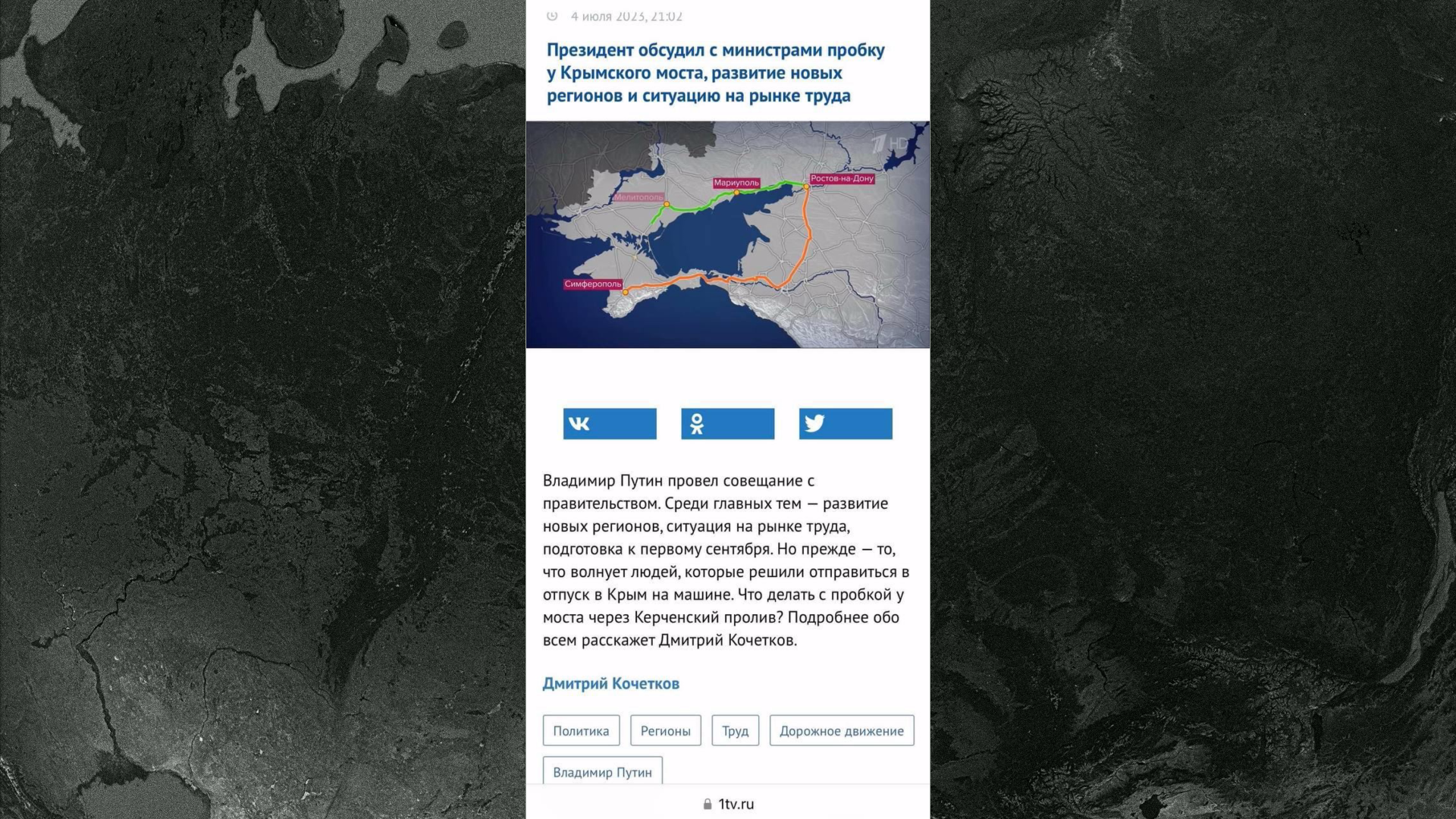 Вот, например, Дмитрий Кочетков, корреспондент «Первого канала», в начале июля выпустил репортаж, где посоветовал россиянам ехать отдыхать в Крым. И сказал, что добираться до него нужно по суше, чтобы в пробке на мосту не стоять. То есть по сути прямым текстом призвал людей ехать в зону боевых действий.