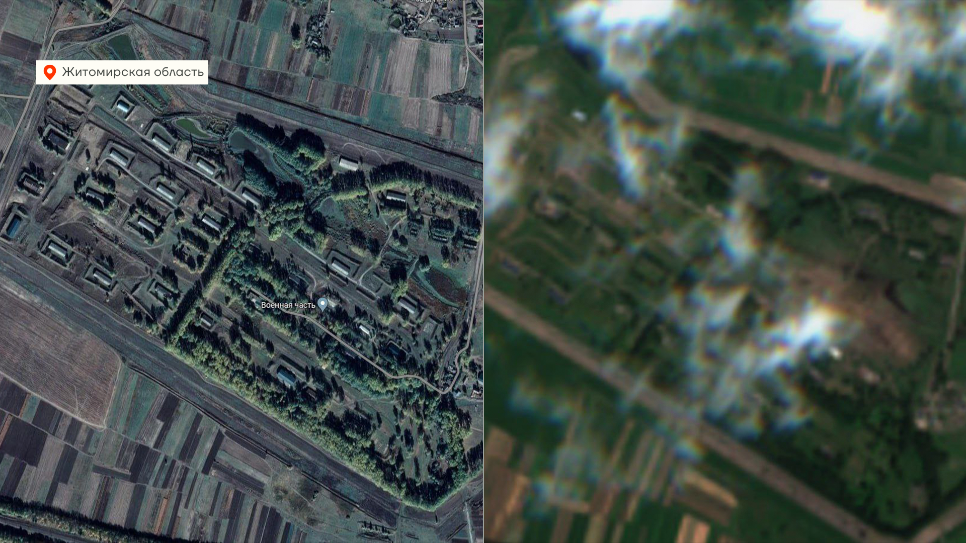Пишут что это результат атаки дрона «Шахед», а на спутниковых снимках результат атаки — склад до подрыва и после. Подробностей пока нет, и сама информация требует проверки, конечно.