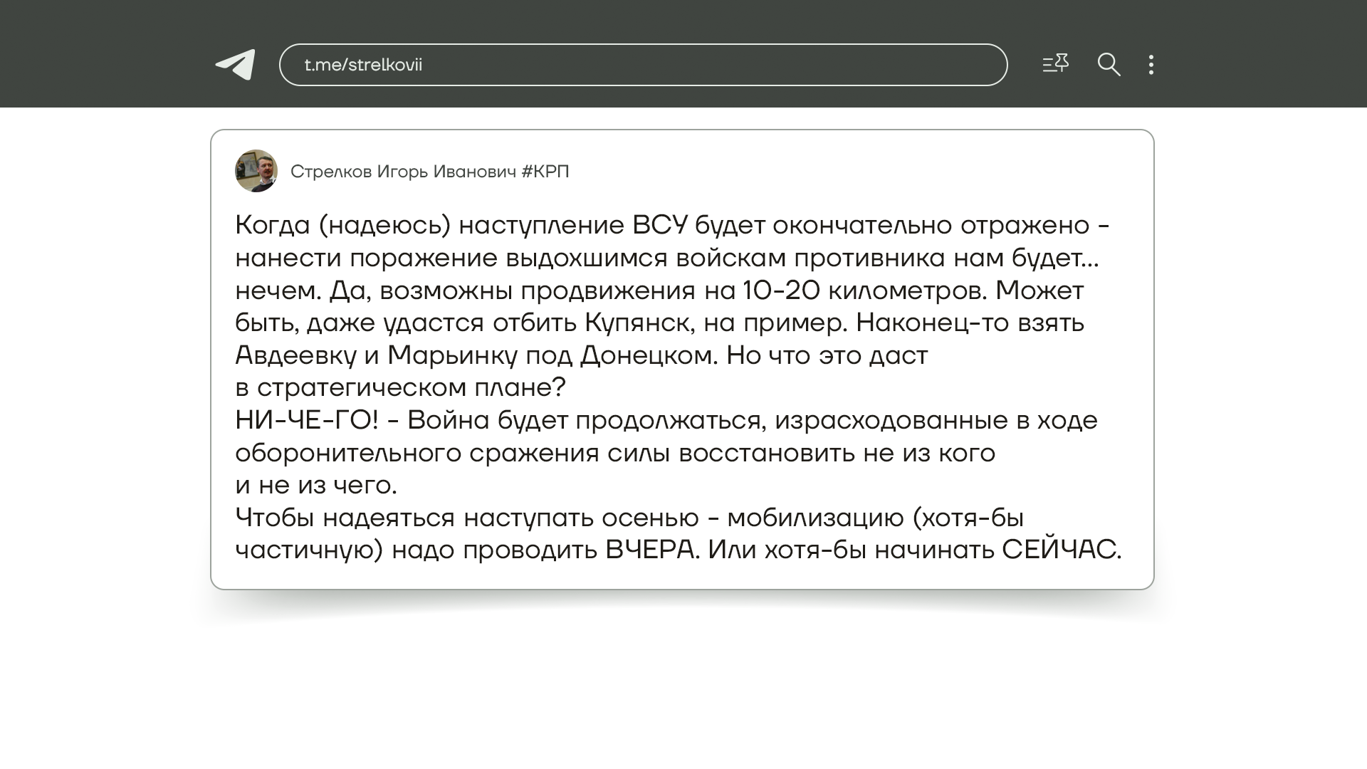 Стрелков-Гиркин устроил краткий экскурс в историю и вспомнил опыт Третьего Рейха, сказал, что нам тоже нужно перевести страну на военные рельсы и что мобилизацию нужно проводить уже сейчас.