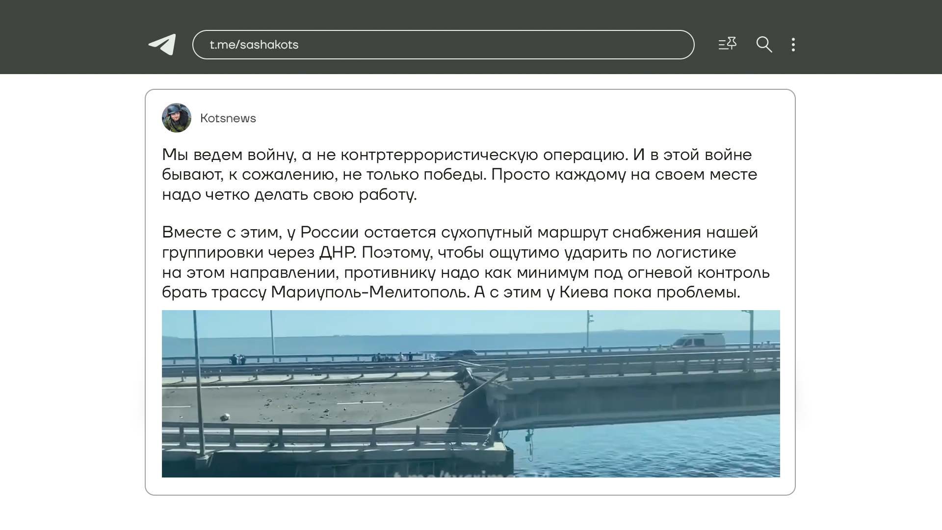 Одной из главных тем обсуждения Z-гнид на этой неделе была, конечно, атака Крымского моста. Вкратце реакция на нее такая: идет война, и на войне бывают не только победы, удары по мосту будут продолжаться, и в целом Крым не изолирован, потому что к нему есть сухопутный коридор через оккупированные территории.