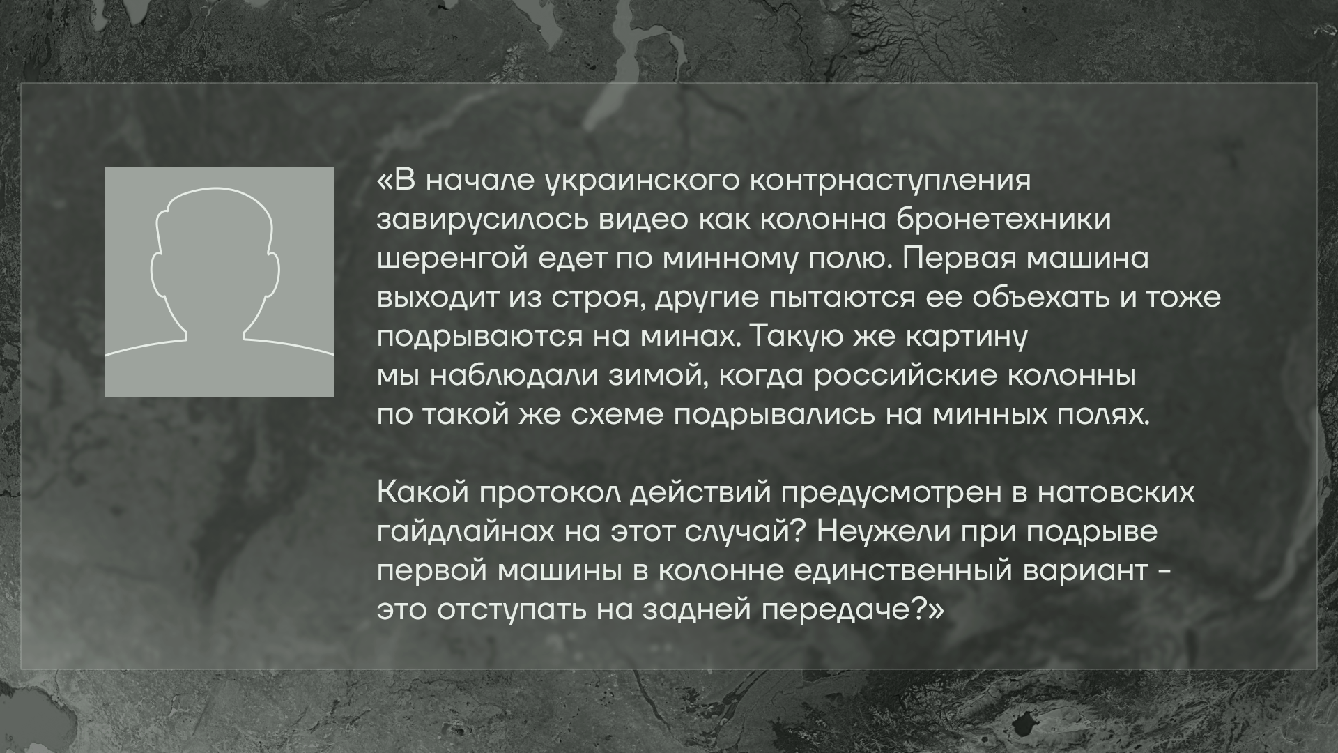 А теперь давайте к вопросам от доноров. В прошлый раз я обещал подготовить ответ на довольно сложный вопрос по поводу движения колонны на минном поле.