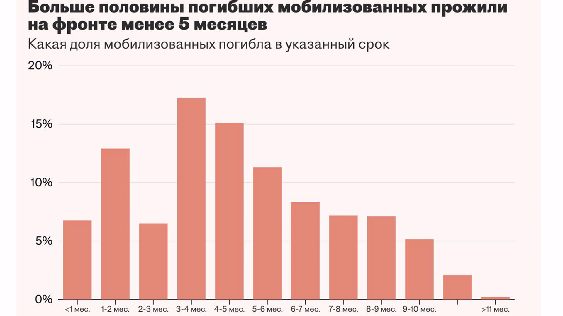 Среди погибших — 3723 мобилизованных. С начала мобилизации прошел год и «Важные истории» вместе с CIT подсчитали, что на фронте среди тех, кто погиб, в среднем мобилизованные прожили 4,5 месяца. Хотя известен случай гибели жителя Челябинской области уже через 9 дней после мобилизации.