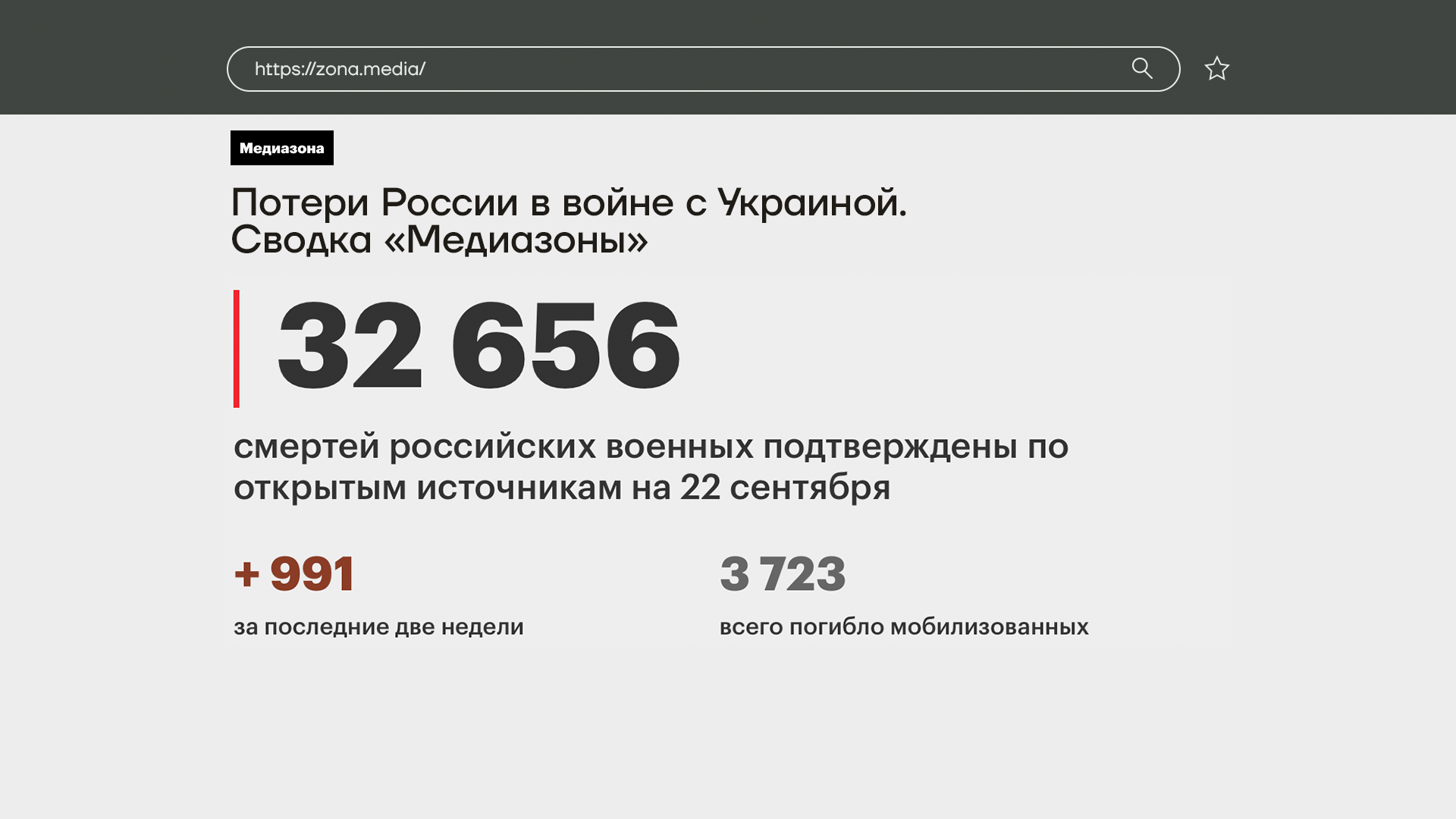 Журналисты установили имена 32 656 погибших российских солдат. За неделю их число увеличивается примерно на 500 человек. Это самые минимальные оценки, так что смело можно говорить о 60 тысячах погибших и больше с российской стороны.