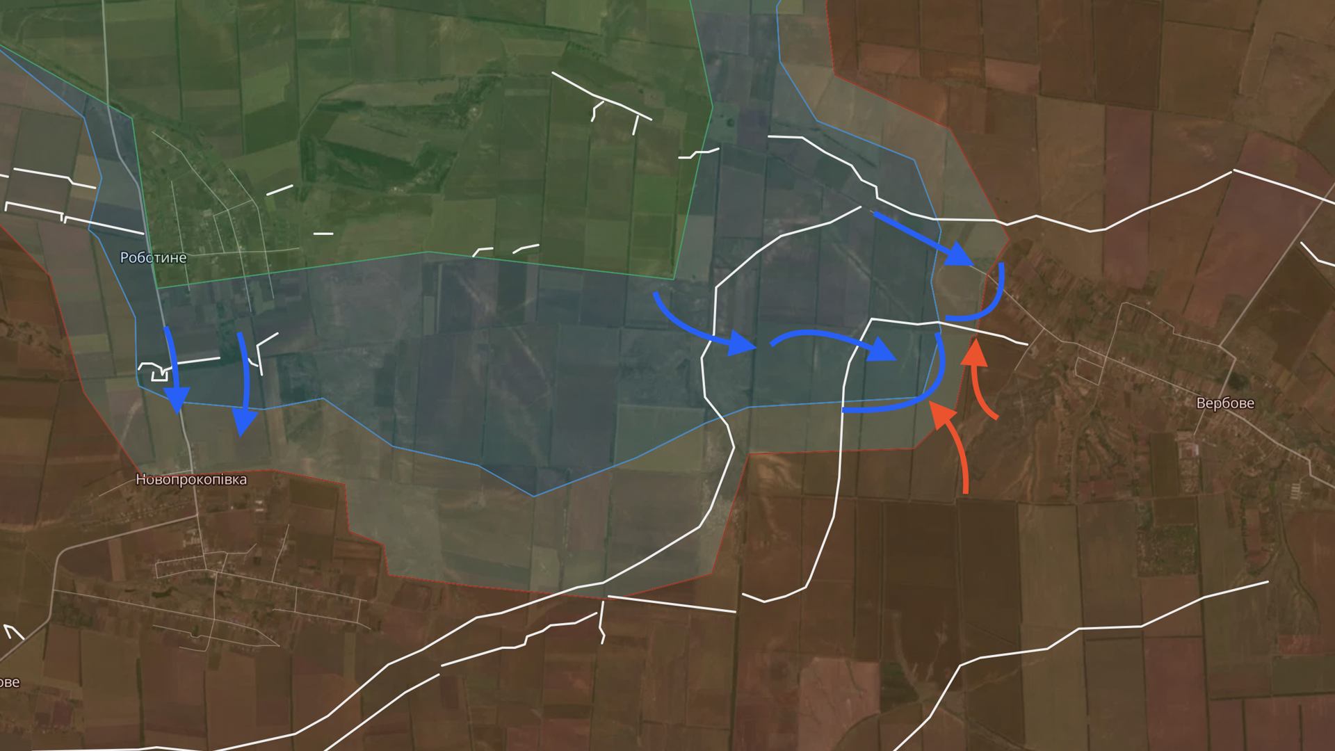 Теперь пару слов о событиях на фронте. Украинские войска прорвали первую линию Суровикина — тяжелая техника была замечена неподалеку от Вербового. А вот все это на карте, видите белые линии это укрепления, я отметил маршрут пересечения. По другому направлению ВСУ уже вошли на окраину села, российские части пытались их контратаковать. Идут атаки и в сторону Новопрокоповки.