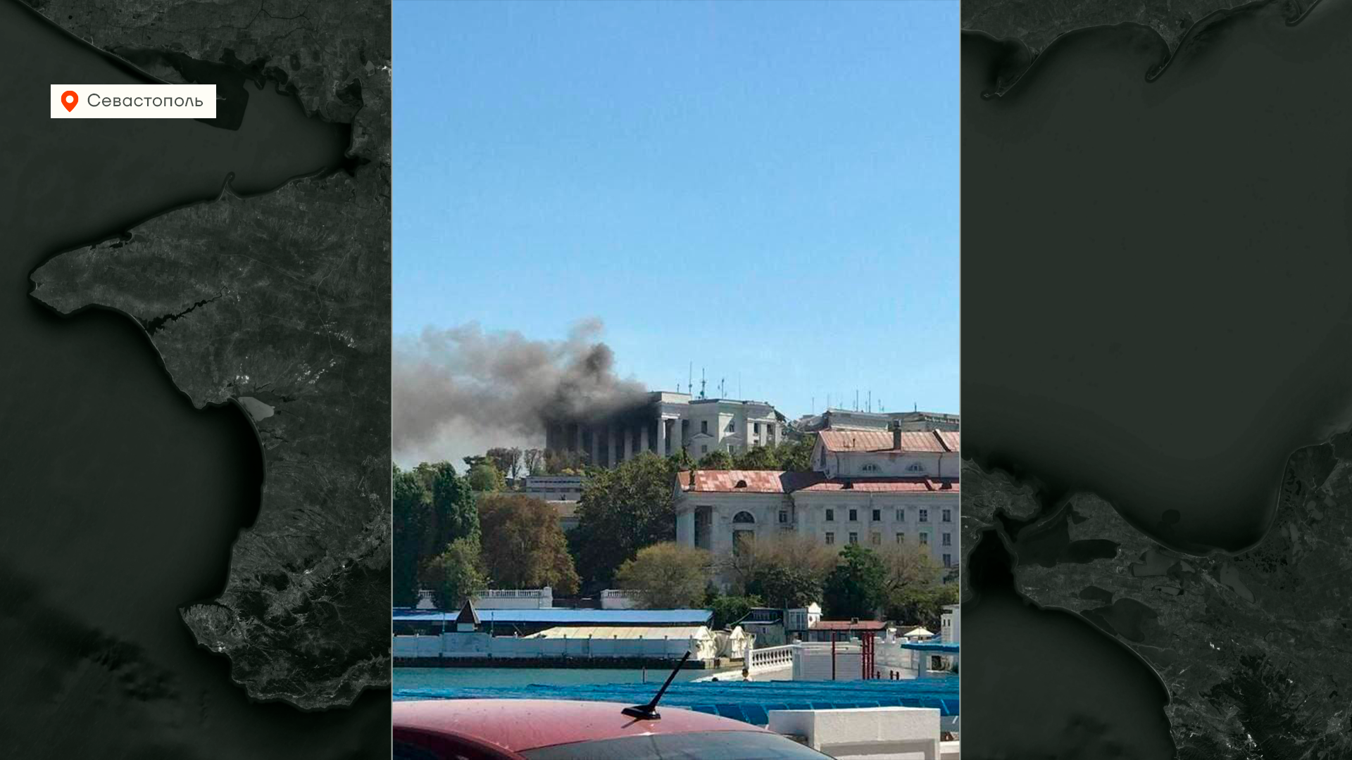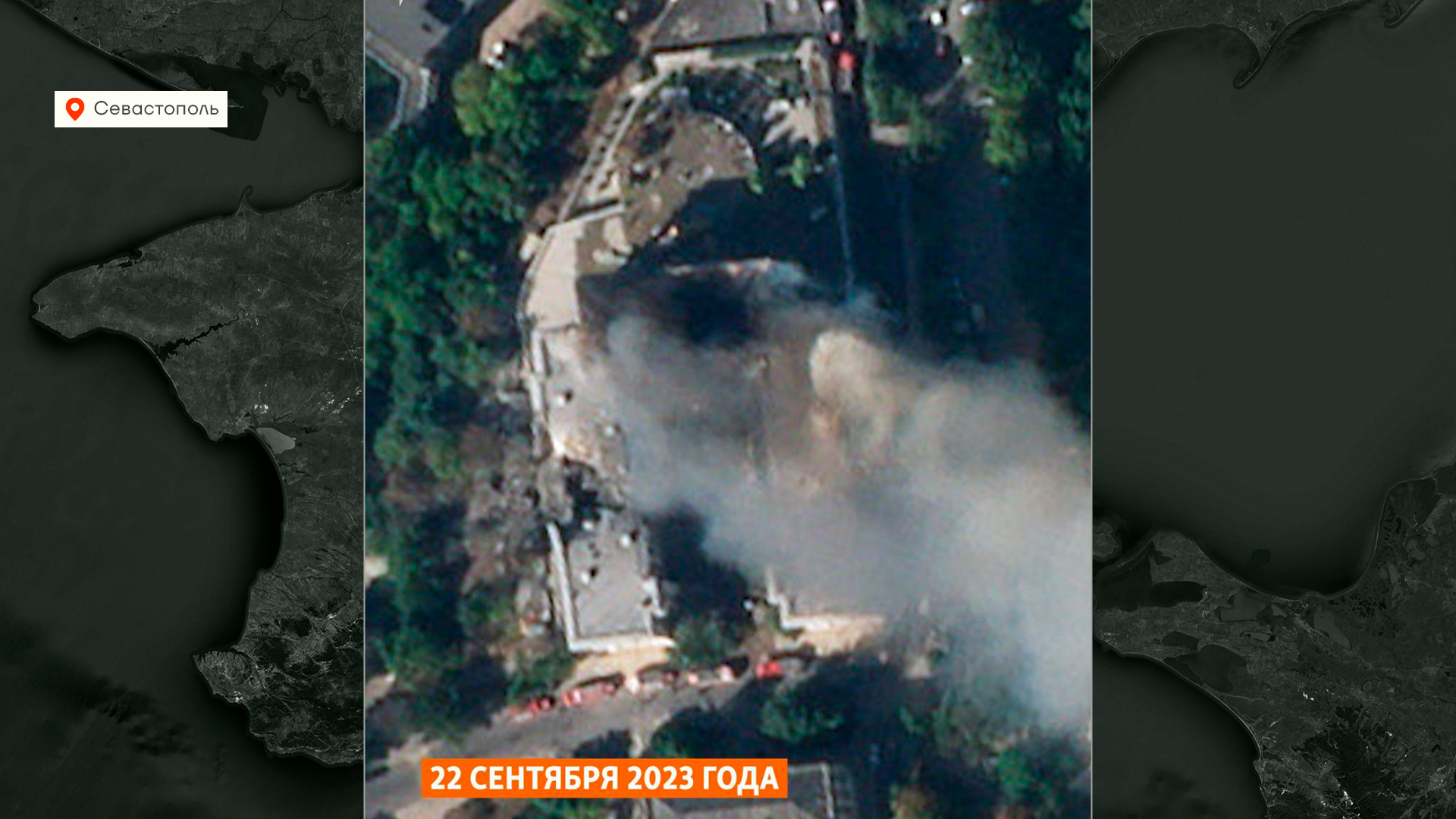 В здание попало сразу несколько крылатых ракет Storm Shadow, начался сильный пожар. Вот так это выглядит со спутника, разрушения сразу в нескольких местах. Российская сторона сообщала всего об одном то ли погибшем, то ли пропавшем без вести военнослужащем — они сами долго не могли определиться. Украинская разведка заявила о ранении и гибели важных российских офицеров.