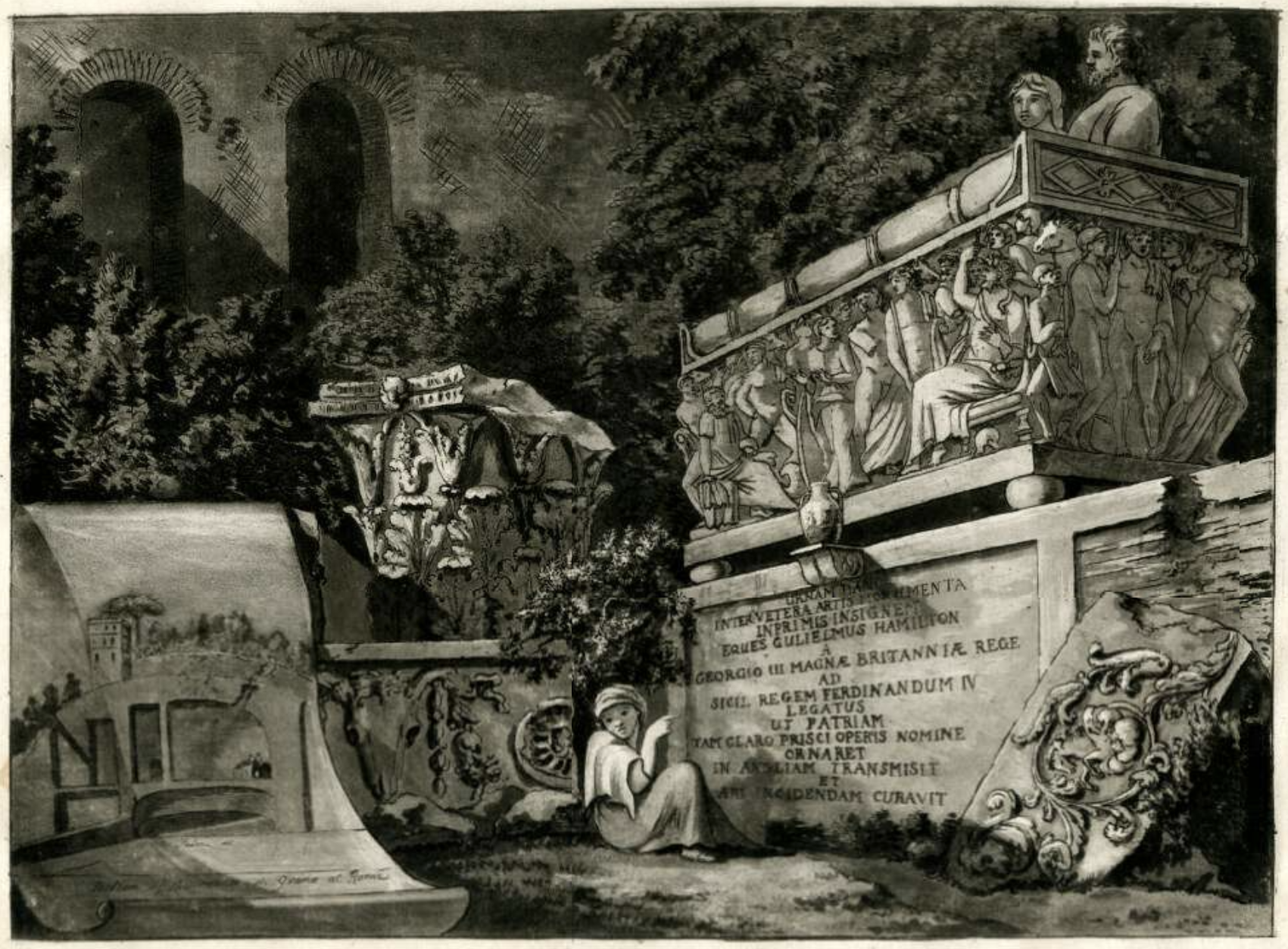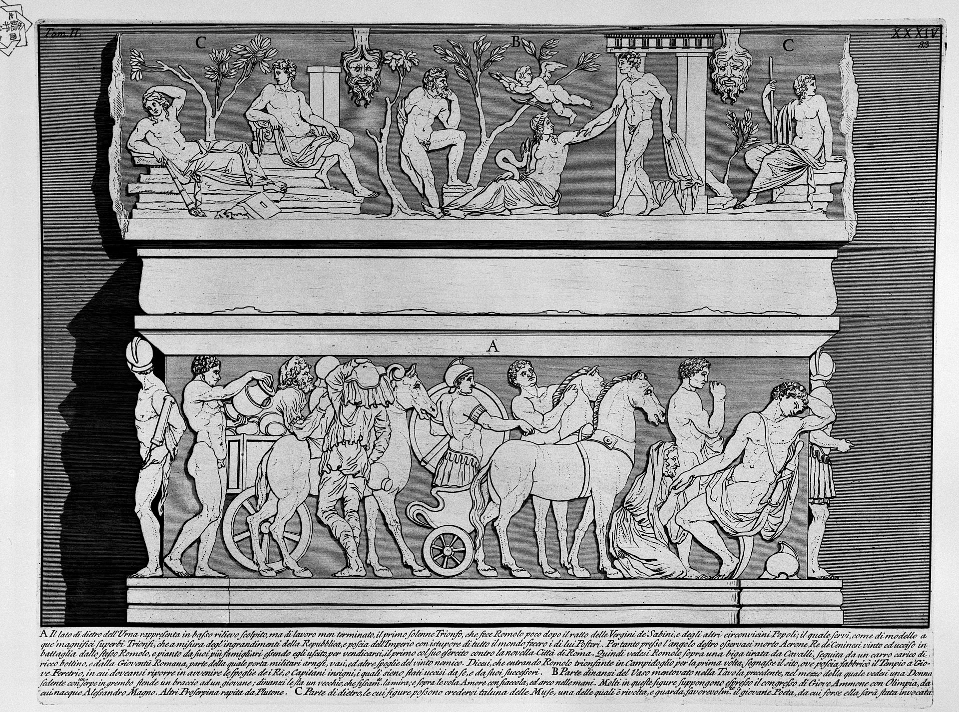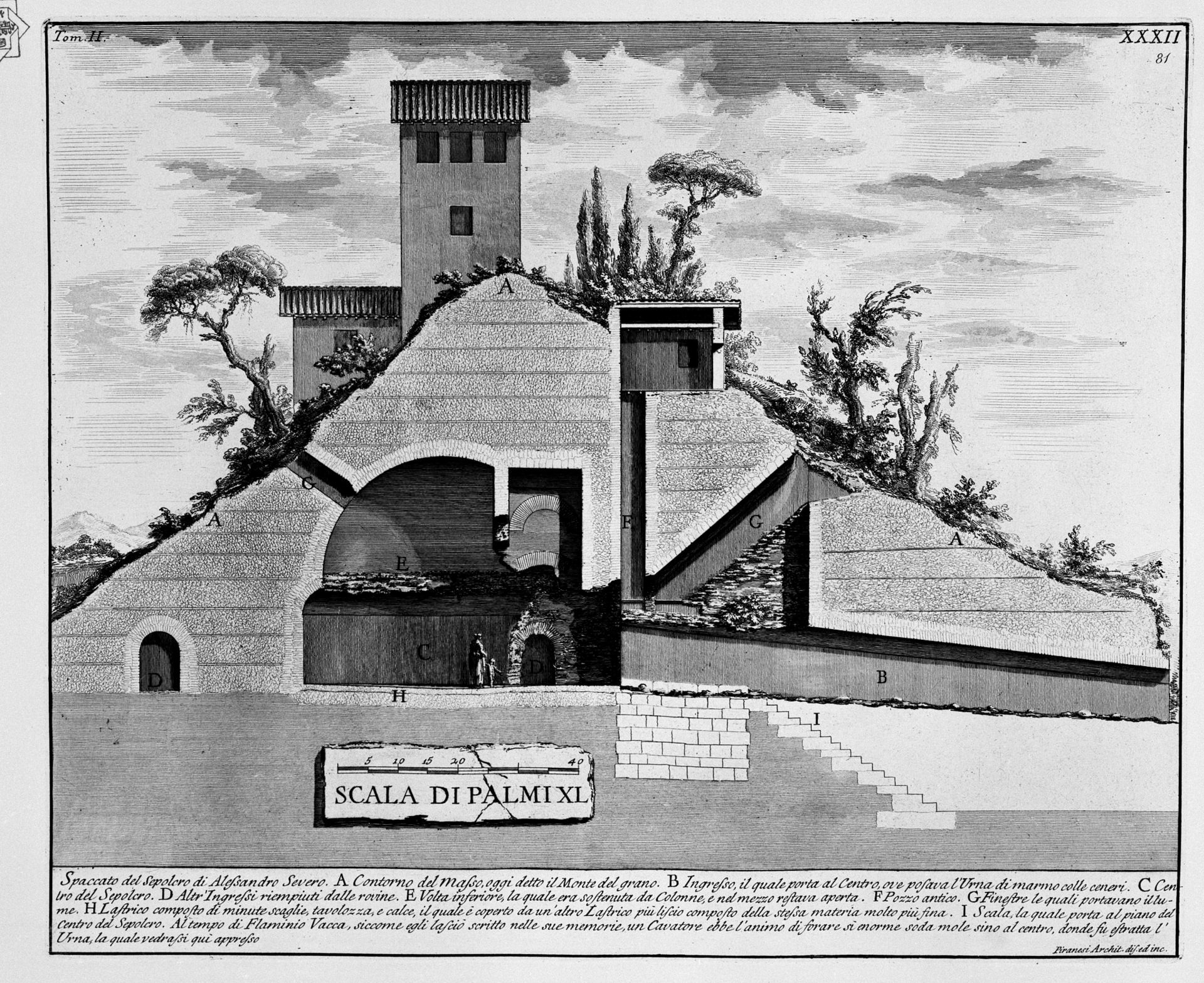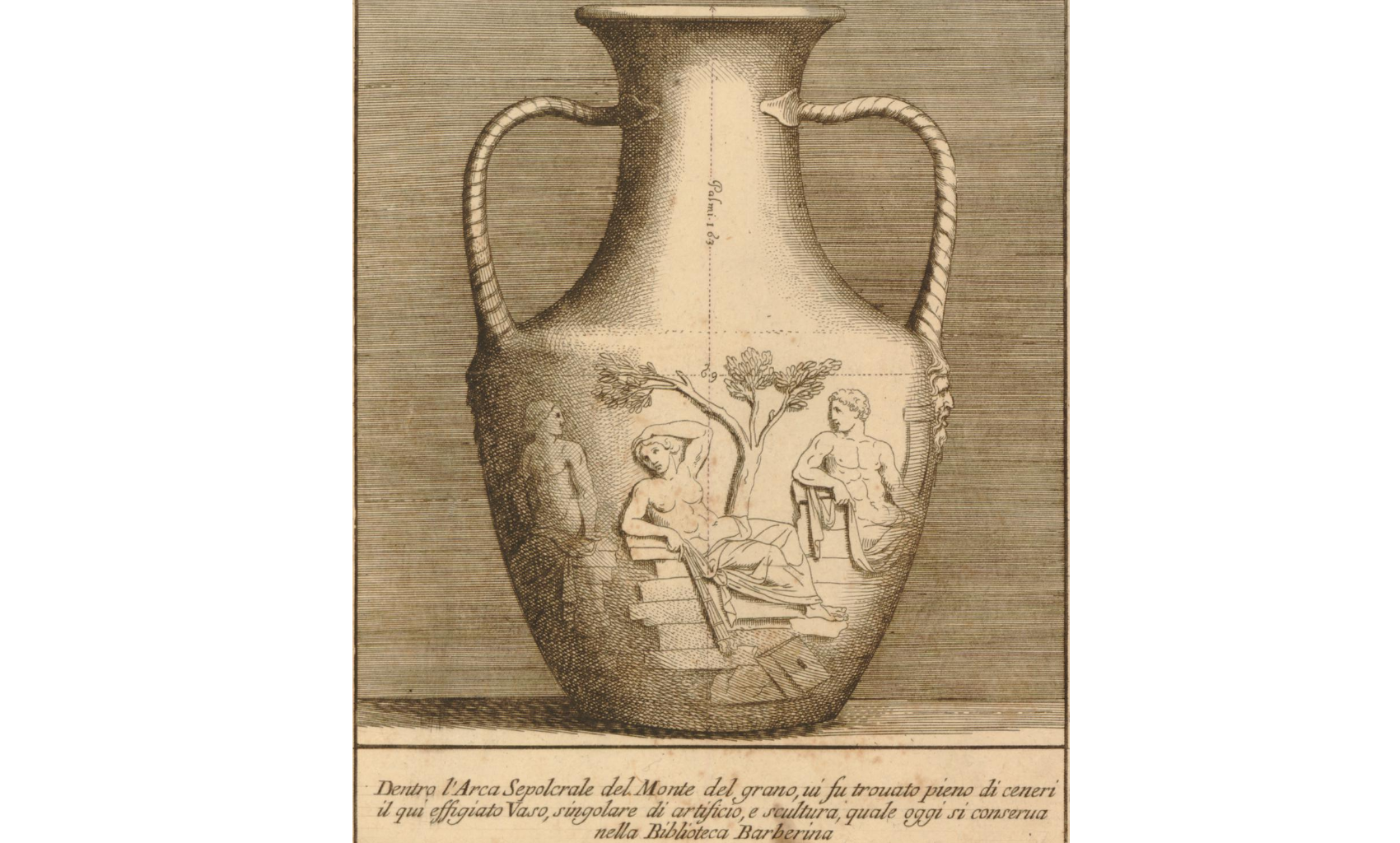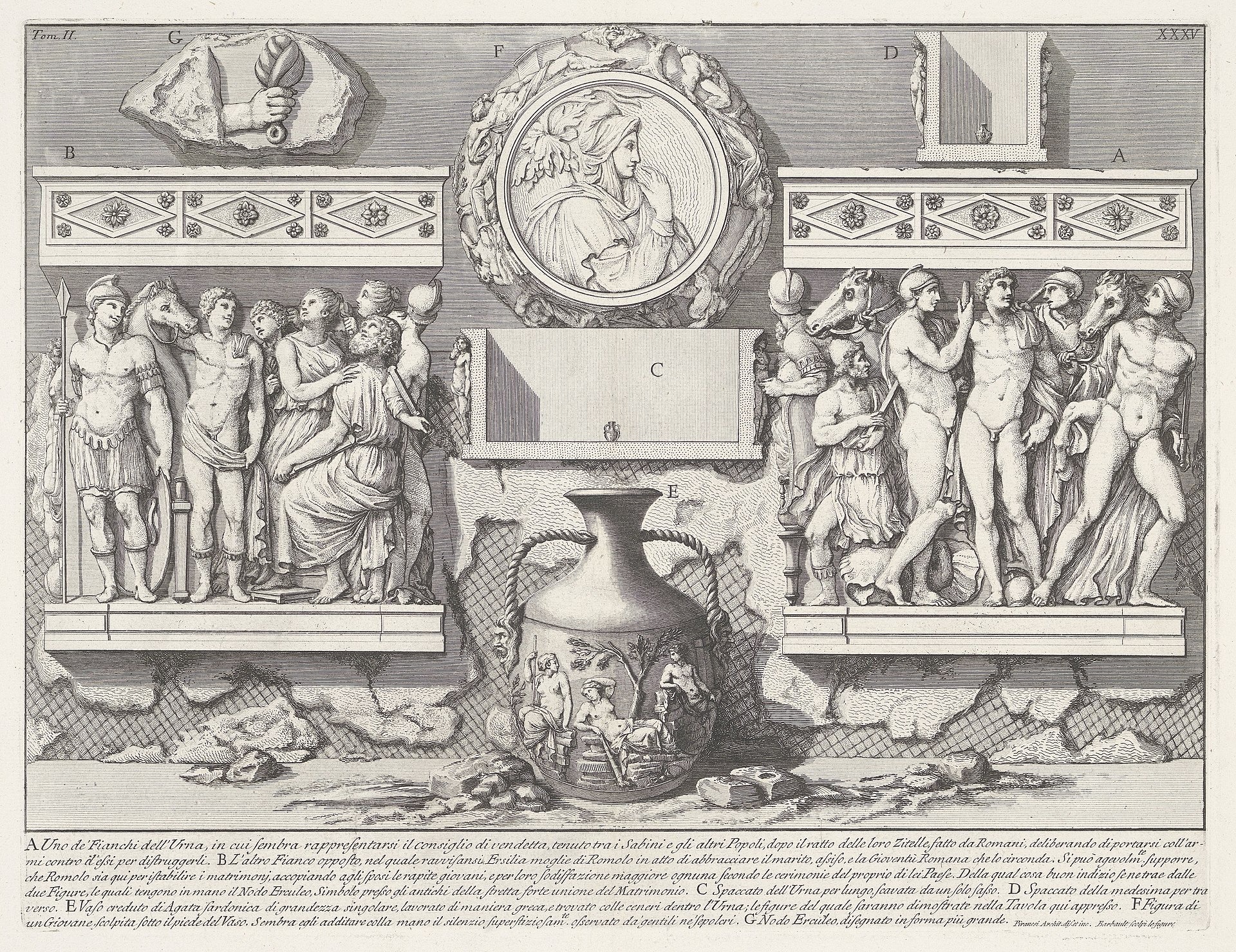 На этой гравюре изображена Портлендская ваза (E) и её основание (F), и соотнесен масштаб вазы которая изображена на дне саркофага (C,D).